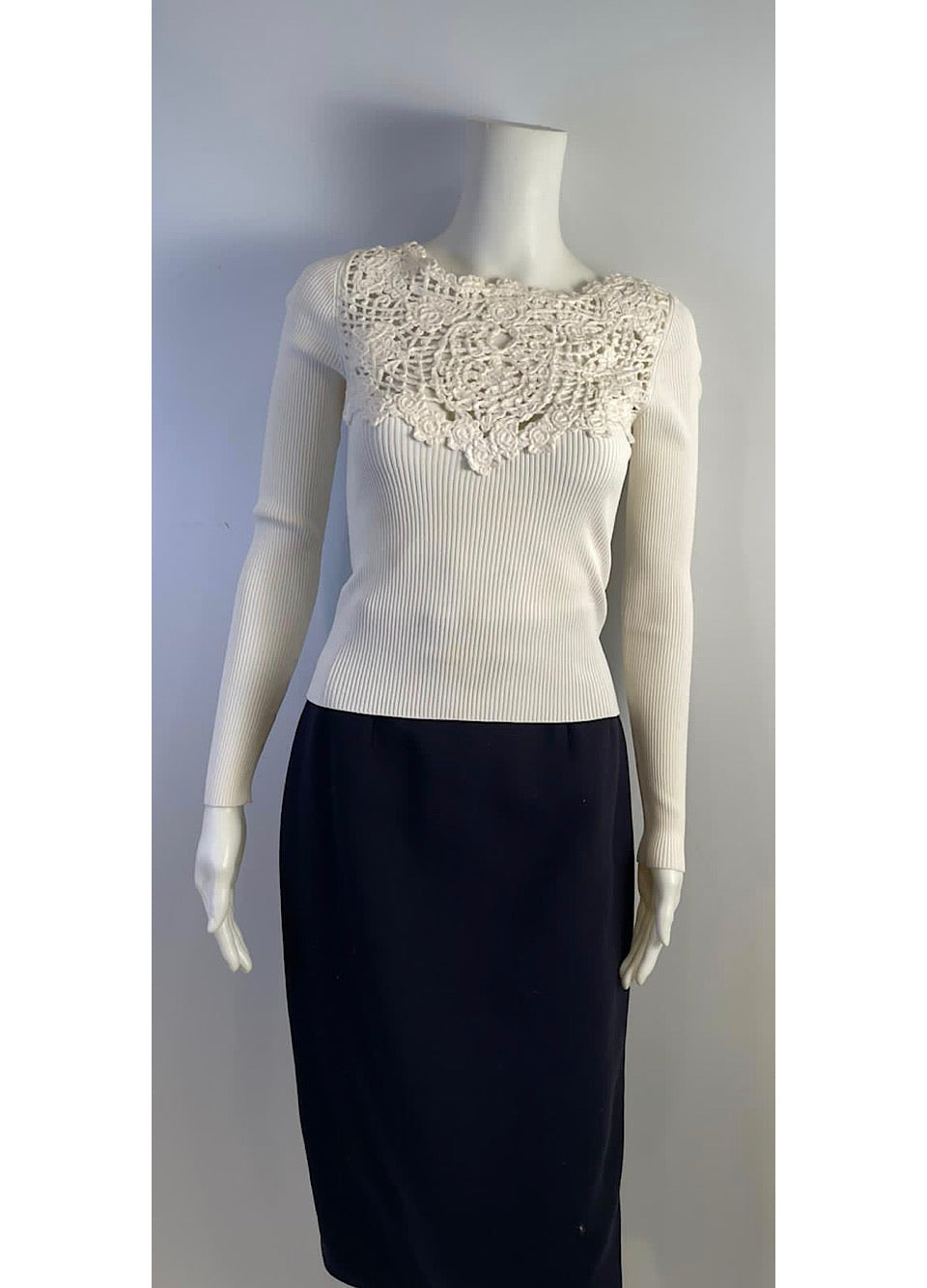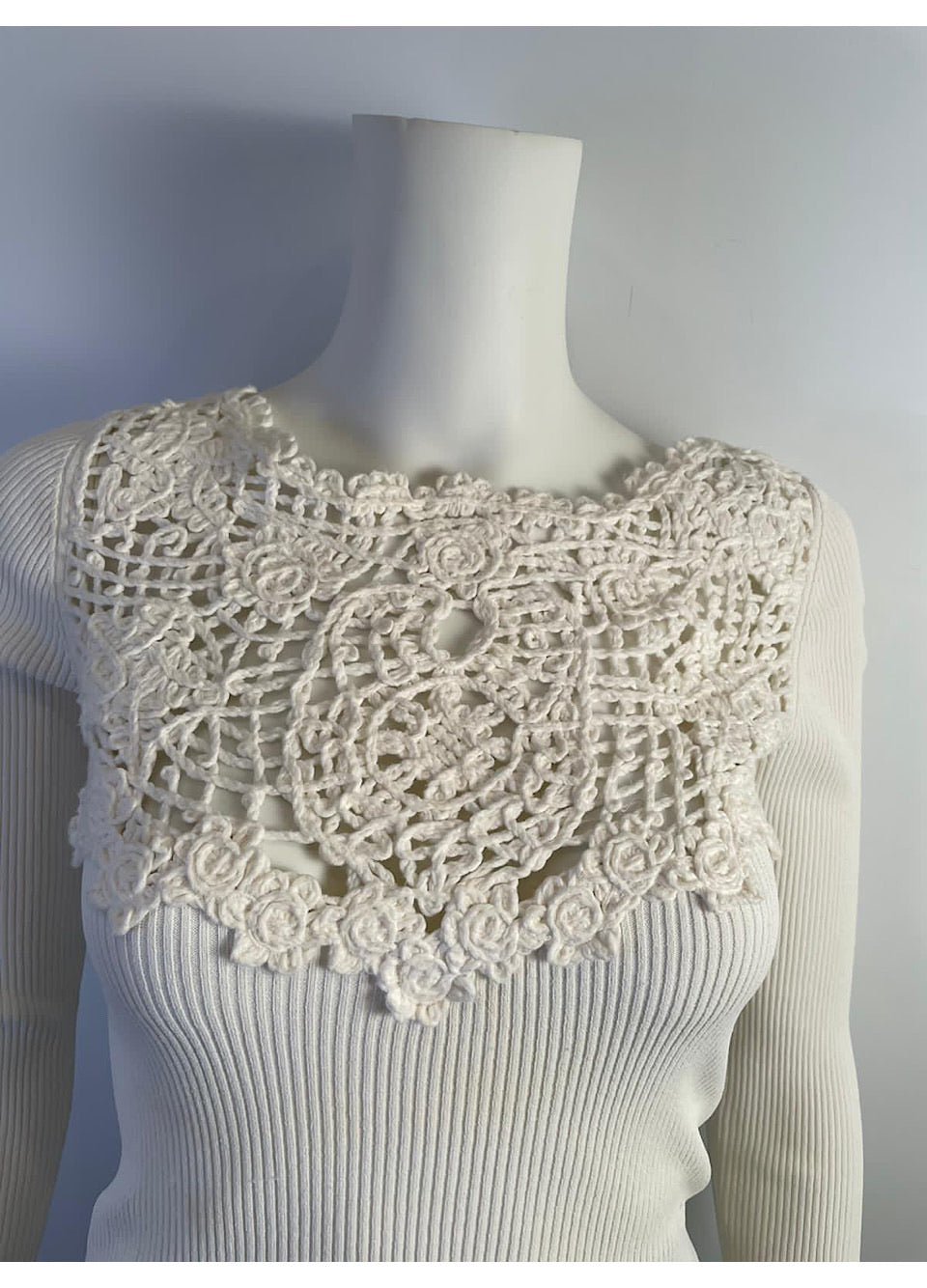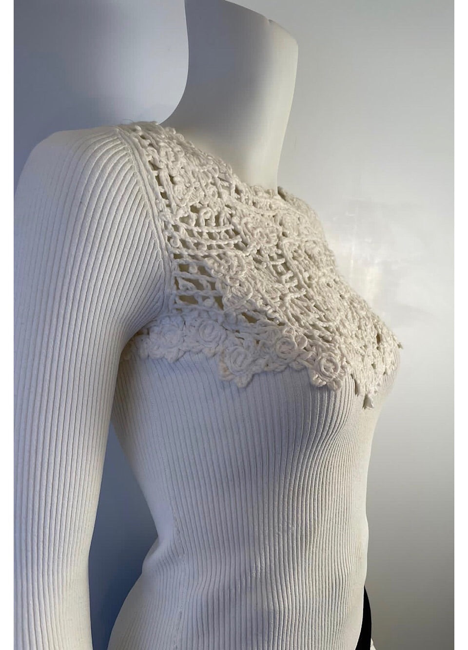 Chanel 05P, 2005 Spring long sleeved white ribbed top with cotton crochet front. The ribbing is stretchy rayon/poly, the crochet work is 100% cotton. This is one of those tops that goes with everything.