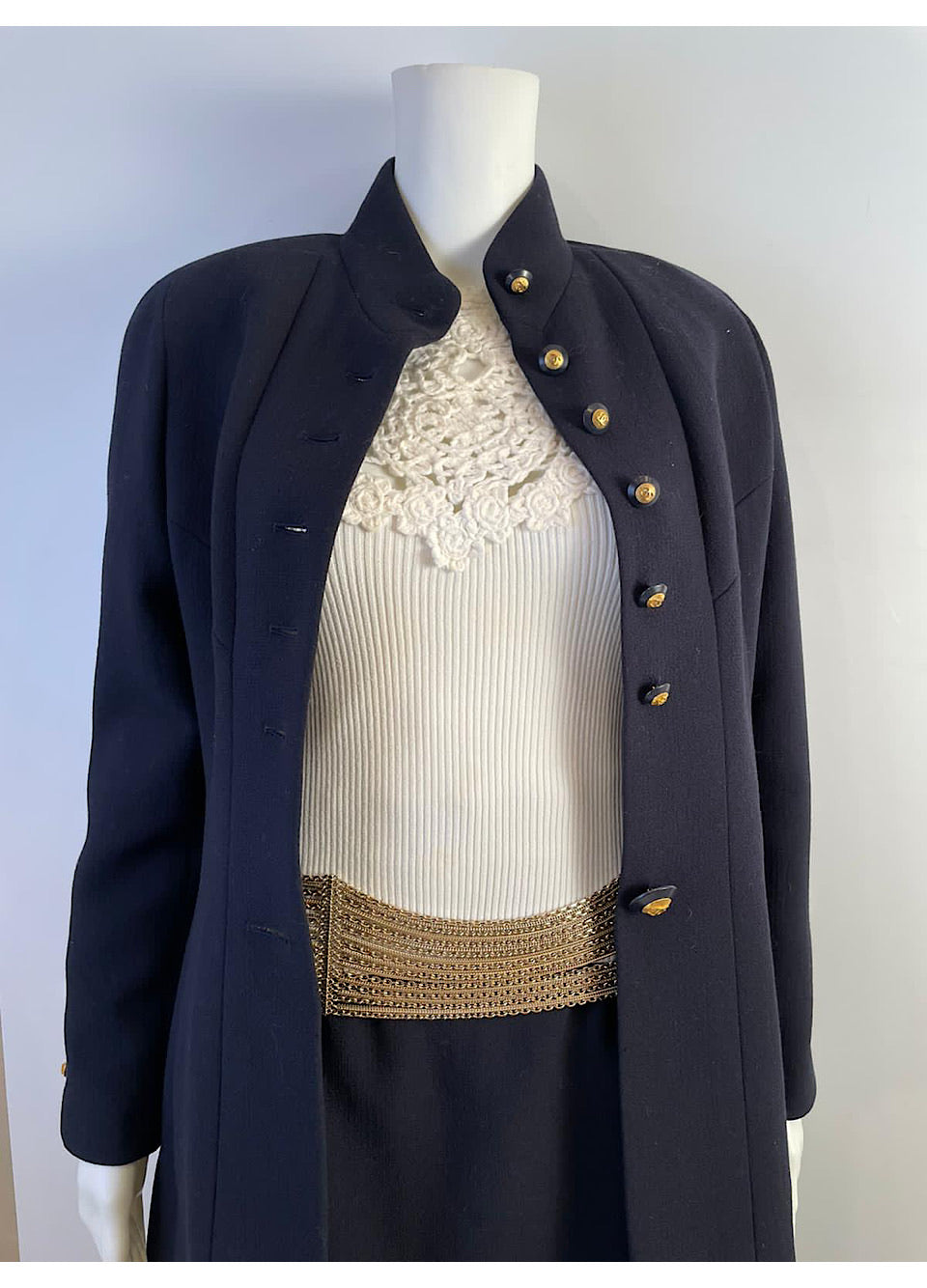 It is shown with a Chanel suit, a Chanel skirt and a Chanel multi chain belt, sold under “Shop All”.