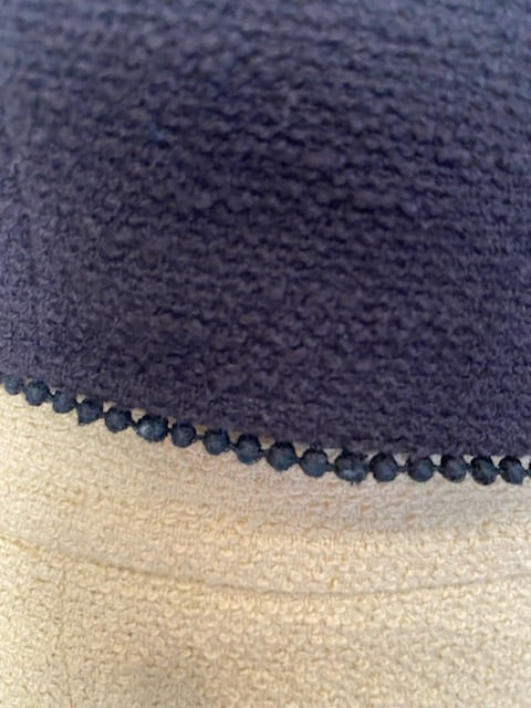 It has a decorative black trim across the top and bottom. The trim looks like beads but is actually a fabric chain with tight balls of thread.
