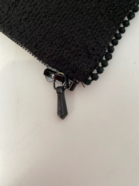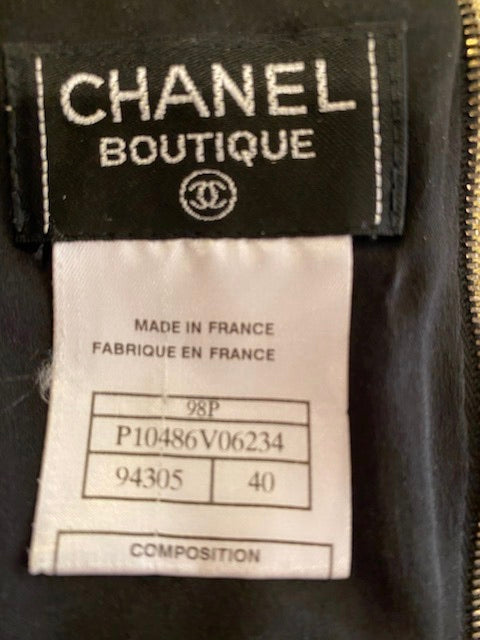 Chanel Vintage 98P, 1998 Spring Black Tube Top Versatile Camisole in heavy textured cotton. It zips up the back with a hidden zipper. The zipper pull has the word “Chanel” in raised letters on it. There are also “stays“ sewn into all 6 of the seams to help keep the top in place.