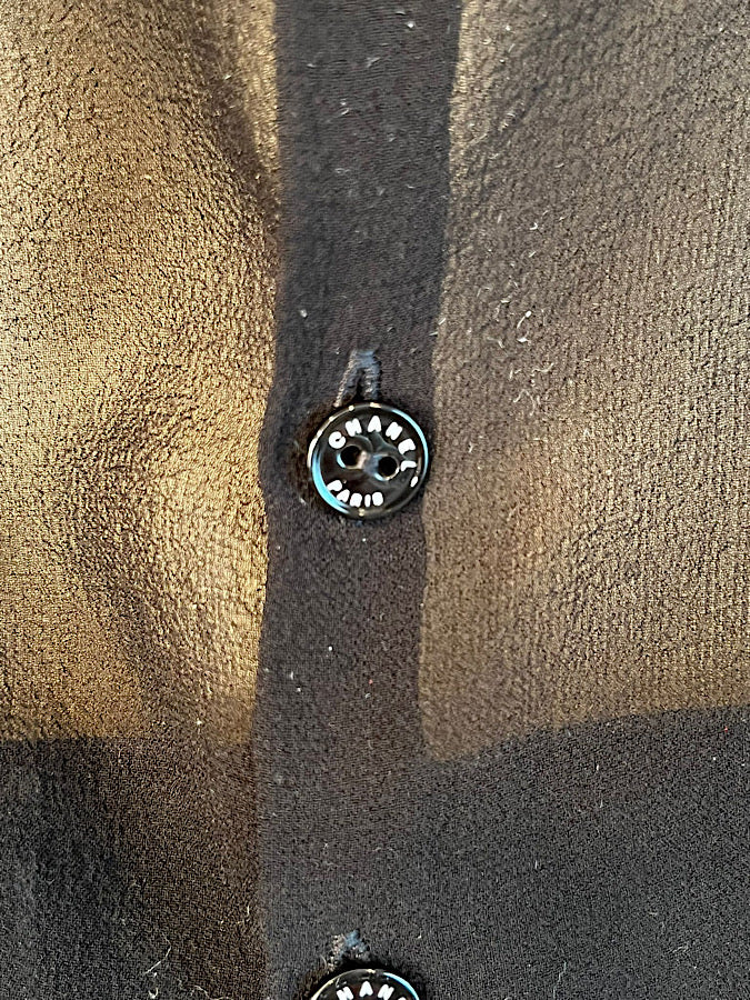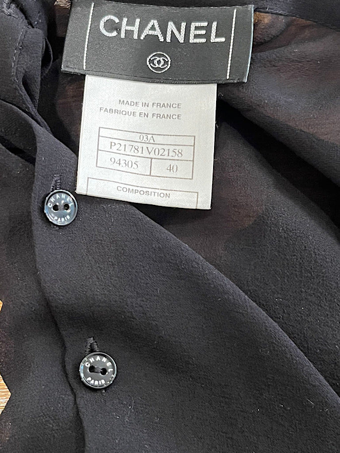 This top will take you anywhere. The front is pleated across the bustling, with a ruffle around the bottom, and from the front this ruffle is anchored by 6 Chanel black buttons with CC's in the center of each. It buttons up the back with 5 small Chanel buttons black with white print which says "Chanel Paris".