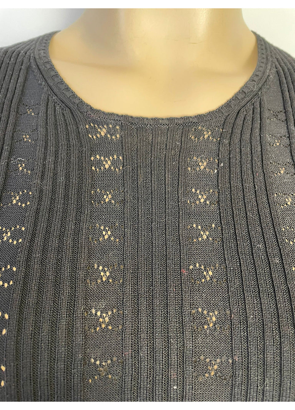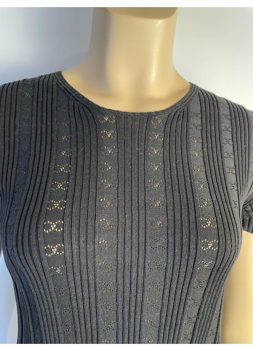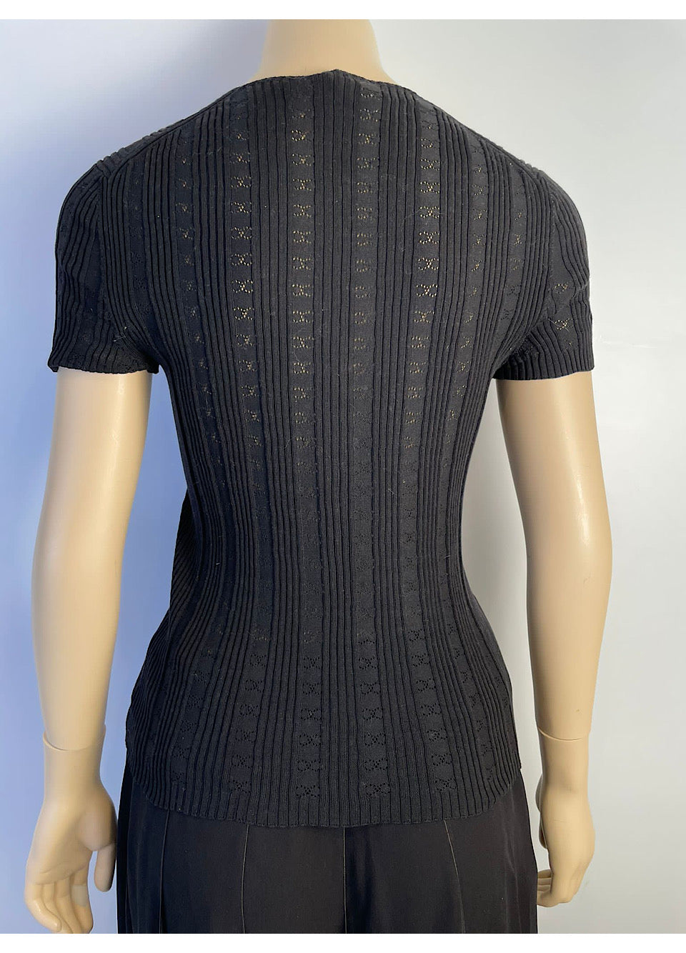 A Chanel wardrobe staple piece from 05P, 2005 Spring Collection! Black knit short sleeve ribbed top that is stretchy and soft. The woven fabric shows a series of vertical rows, each 5/8" wide, with alternating thin ribbing, and flat fabric with "CC" logos created by cut outs. The more it stretches, the clearer the CC logos get. This is one of those go to pieces that works with any casual outfit.