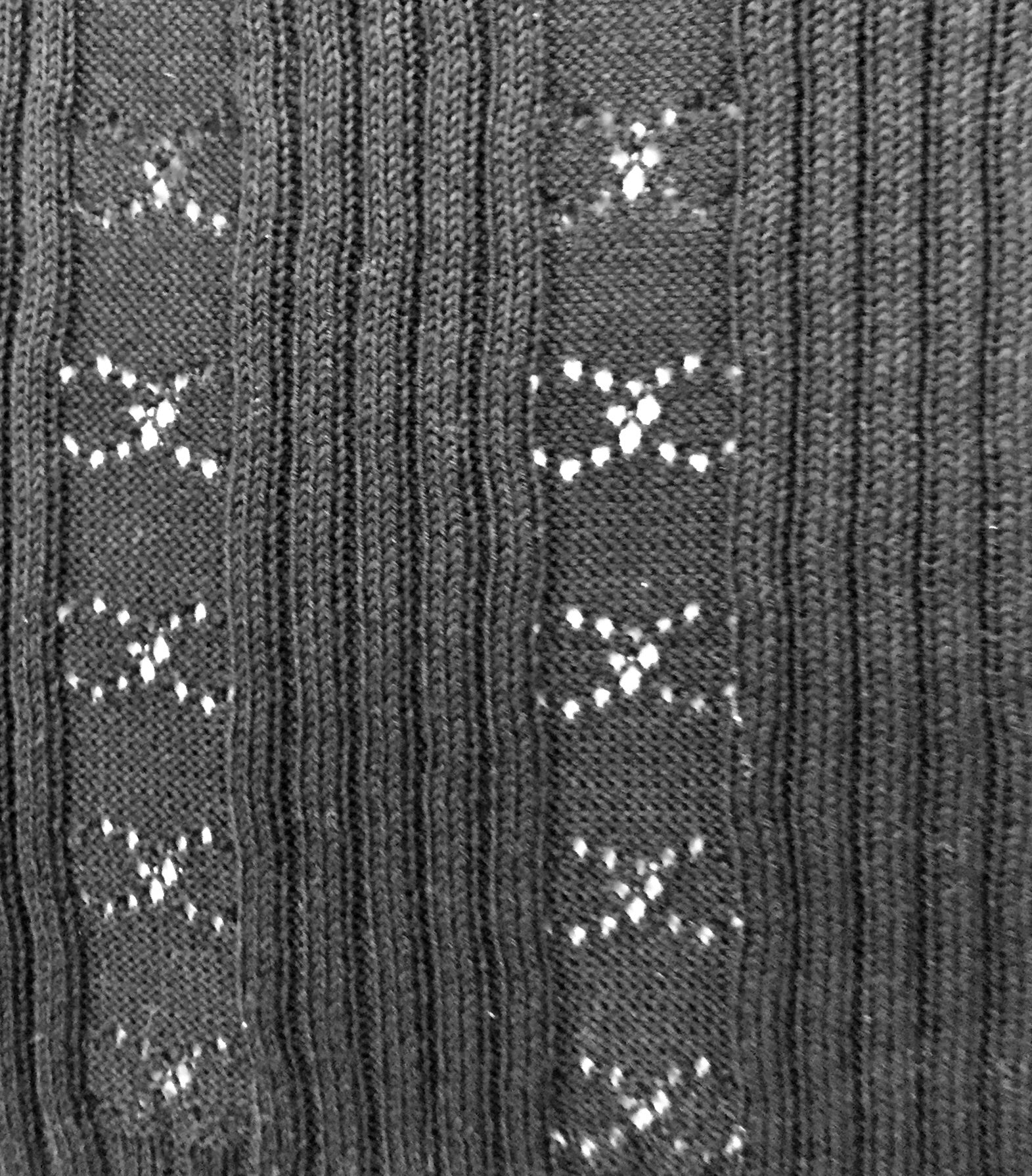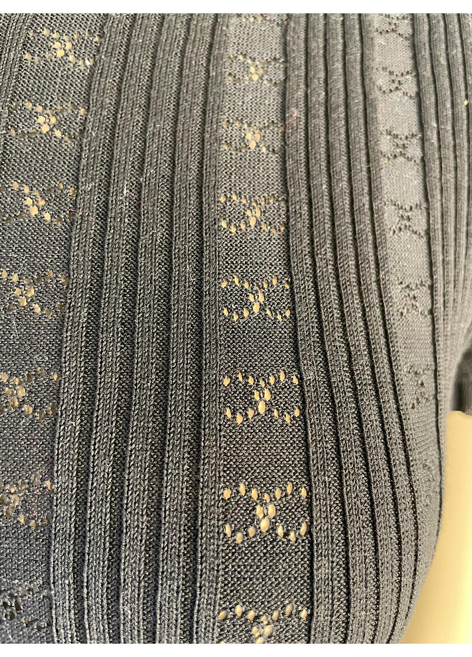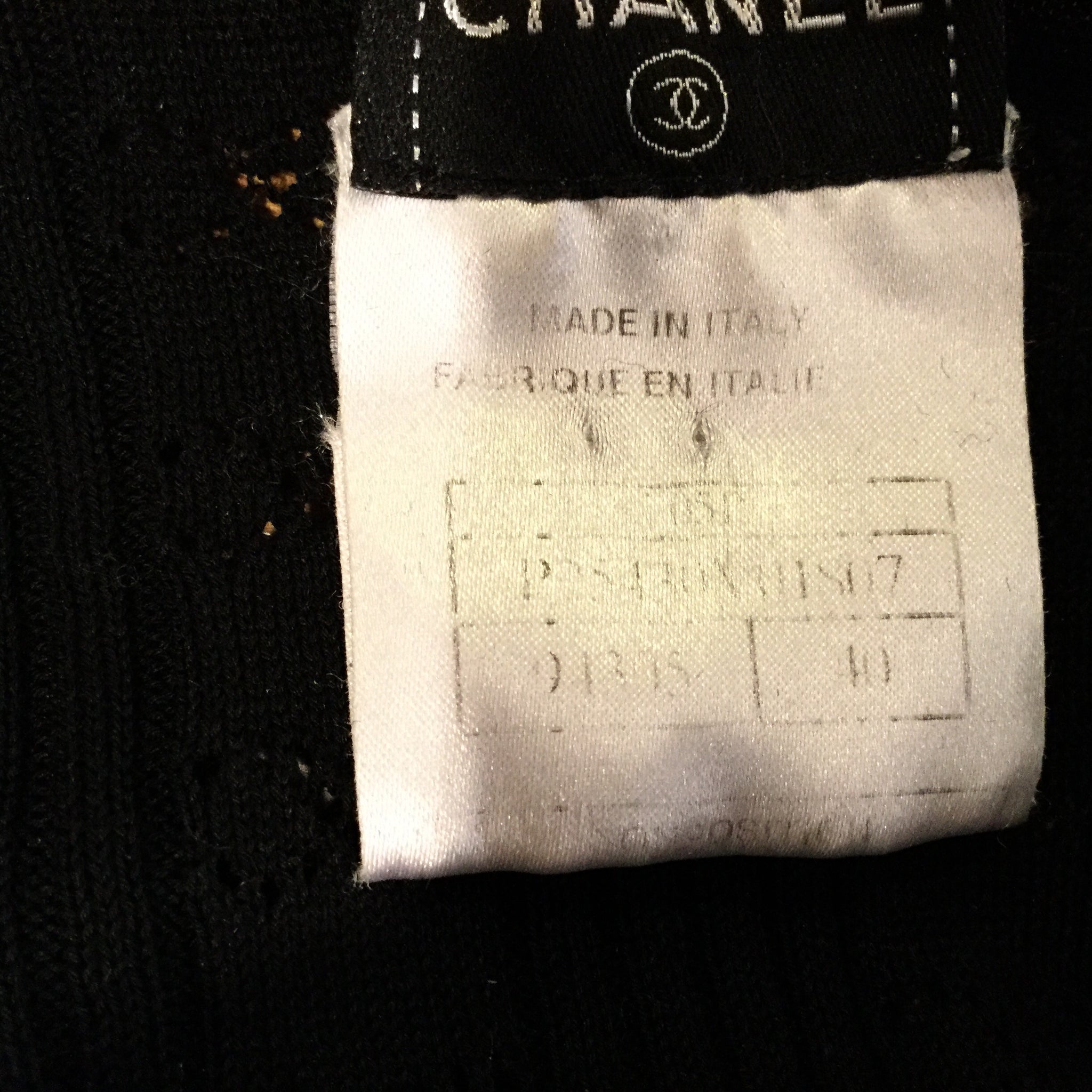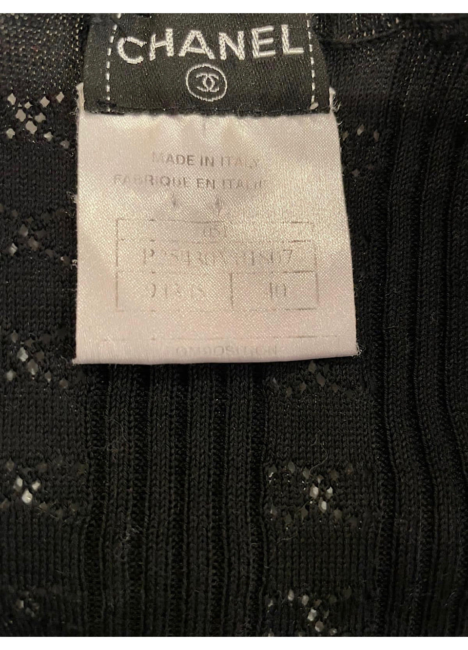 A Chanel wardrobe staple piece from 05P, 2005 Spring Collection! Black knit short sleeve ribbed top that is stretchy and soft. The woven fabric shows a series of vertical rows, each 5/8" wide, with alternating thin ribbing, and flat fabric with "CC" logos created by cut outs. The more it stretches, the clearer the CC logos get. This is one of those go to pieces that works with any casual outfit.