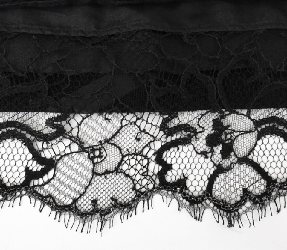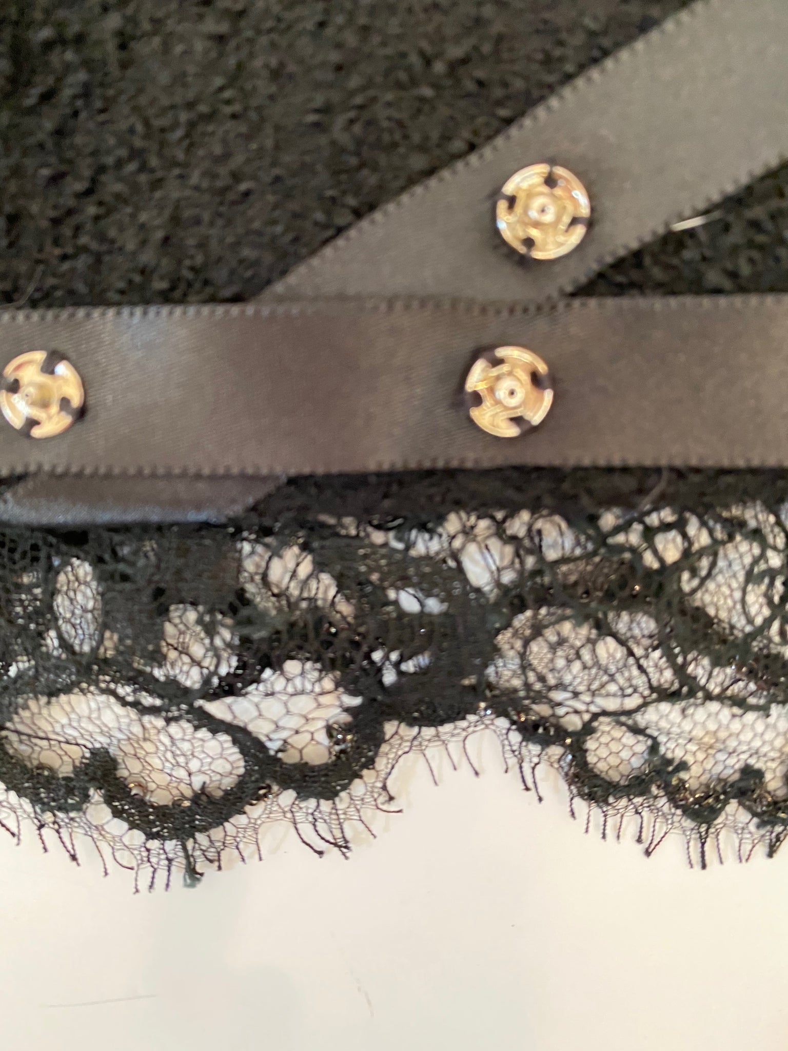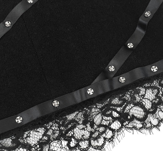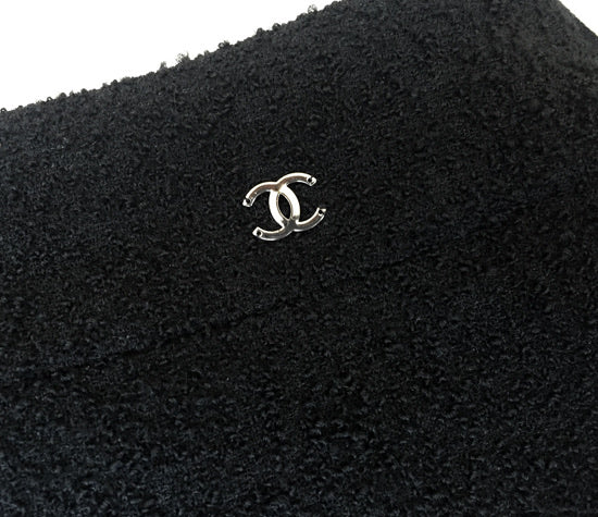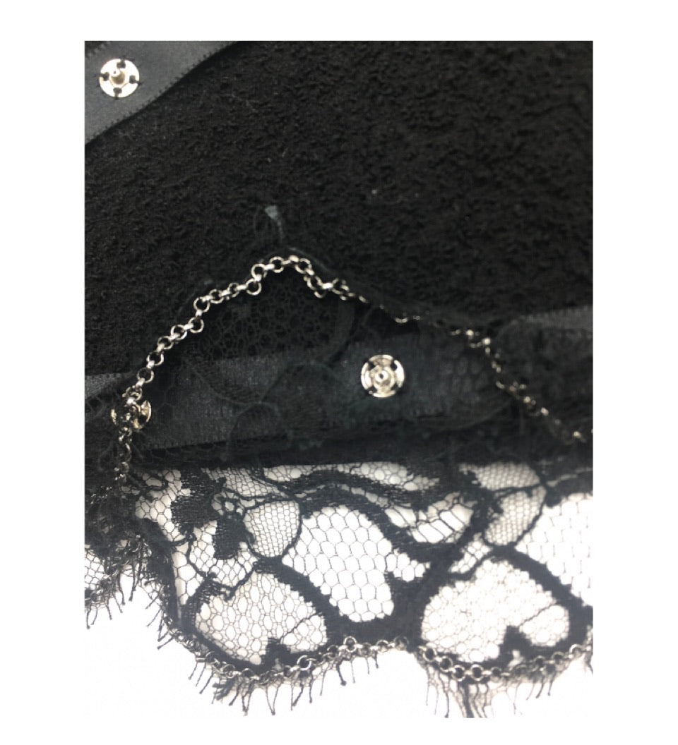 Chanel 03A, 2003 Fall Snap Collection Black crepe tweed Boucle wool mini skirt. Fully lined. Matching jacket also online. No waistband, metal CC at waist. All around the bottom of the lace itself is a tone black chain - similar to the ones you often see on Chanel jacket hems. It’s purpose is to make whatever is it attached to, hang straight and evenly which is a real plus for lace.