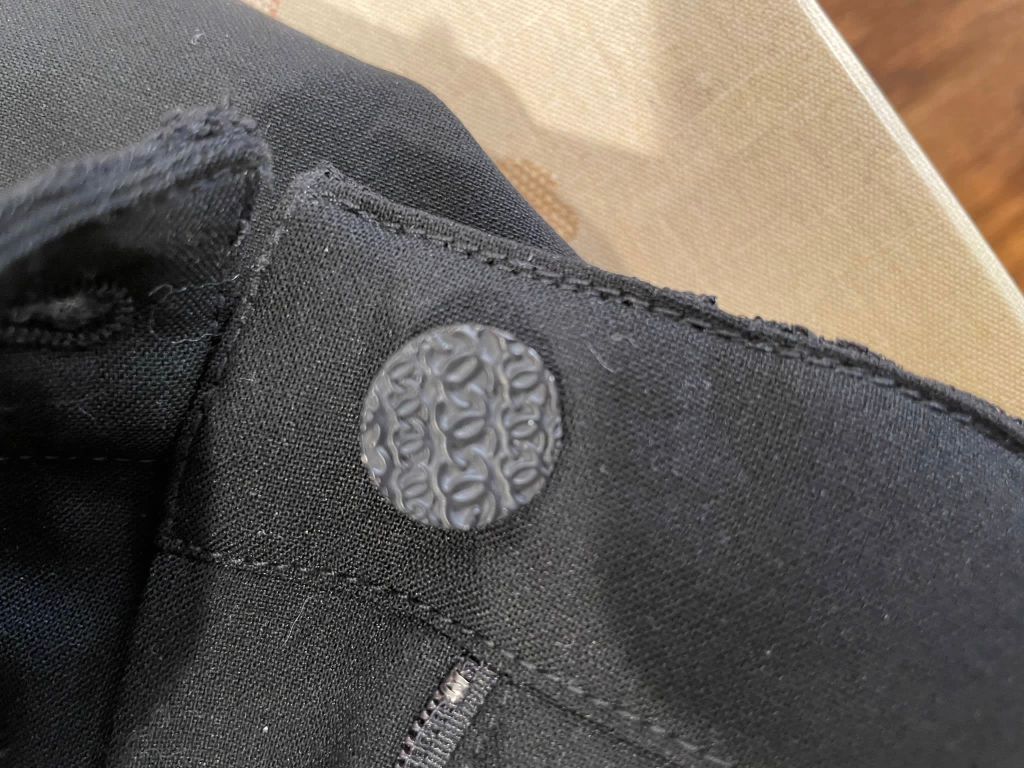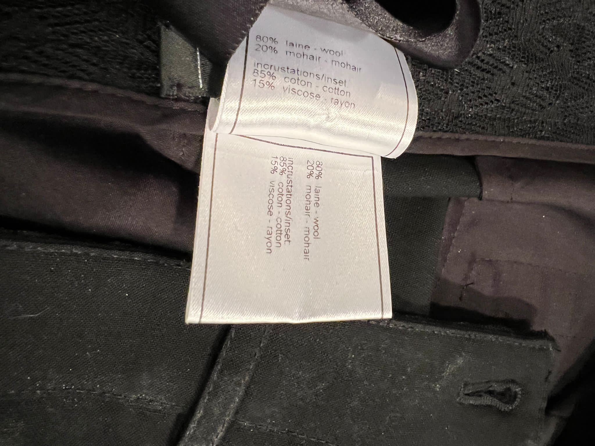 Composition 80% Chanel's lightweight summer wool, 20% mohair, also a summer weight producing a smooth to the touch non-textured lightweight fabric. Pre creased with a 1 3/4" lace trim, fly front, a subtle slash pocket on each hip, 2 very shallow pockets on the back -still sewn shut- belt loops, and a CC button at the waist which actually sits slightly below the natural waist.