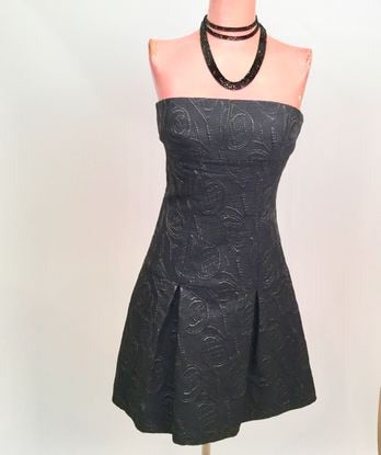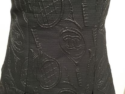 Beautiful Chanel 09P Collection tennis cocktail dress-strapless, fitted waist, with 7" wide pleats to the hem. The top has a thin silicone strip around the inside which helps hold it up. The dress is very dark navy, with a series of stitches forming lots of 5 1/2" long tennis rackets with 2" "CC" logos on the racket faces. These are outlined with silver threads which catch the light to let you see the design. It is subtle but with a sparkle.