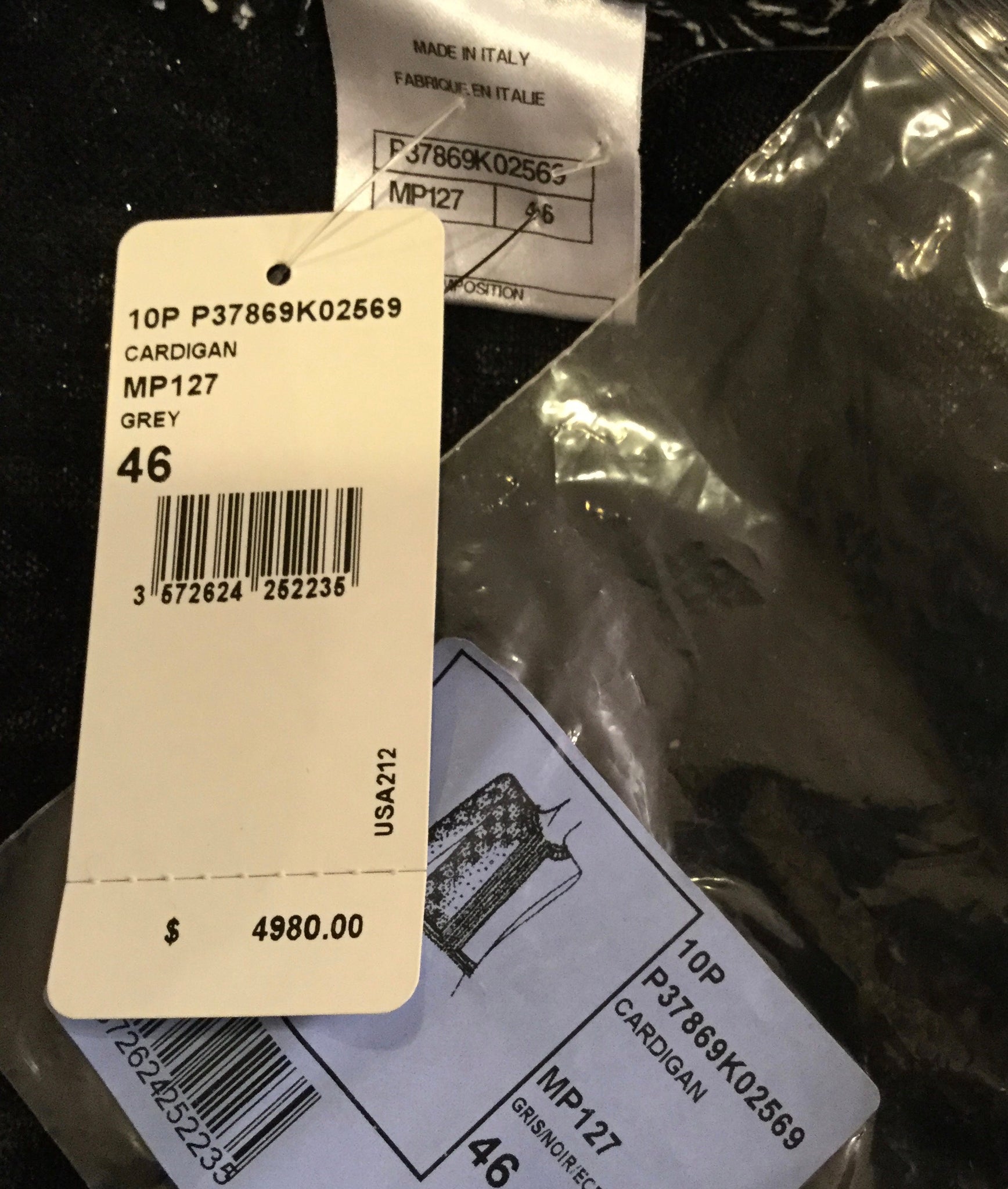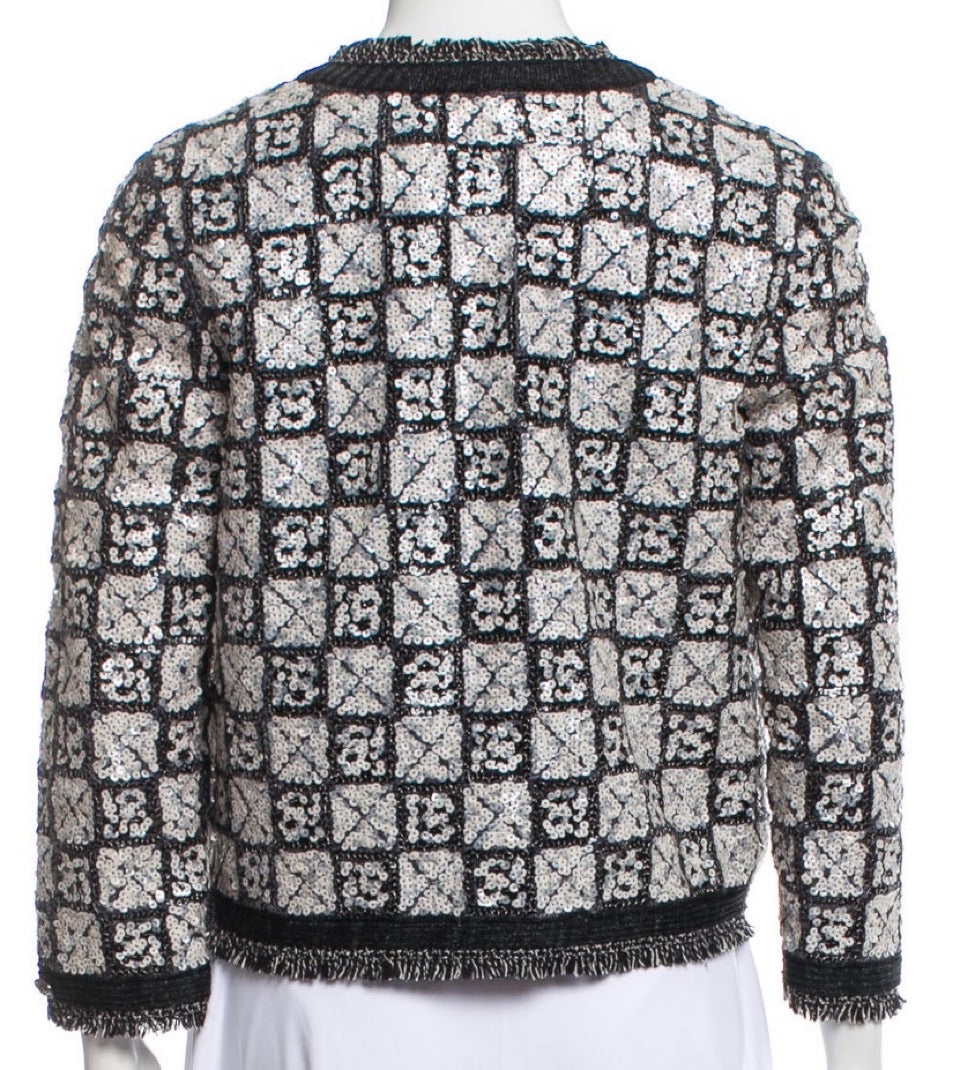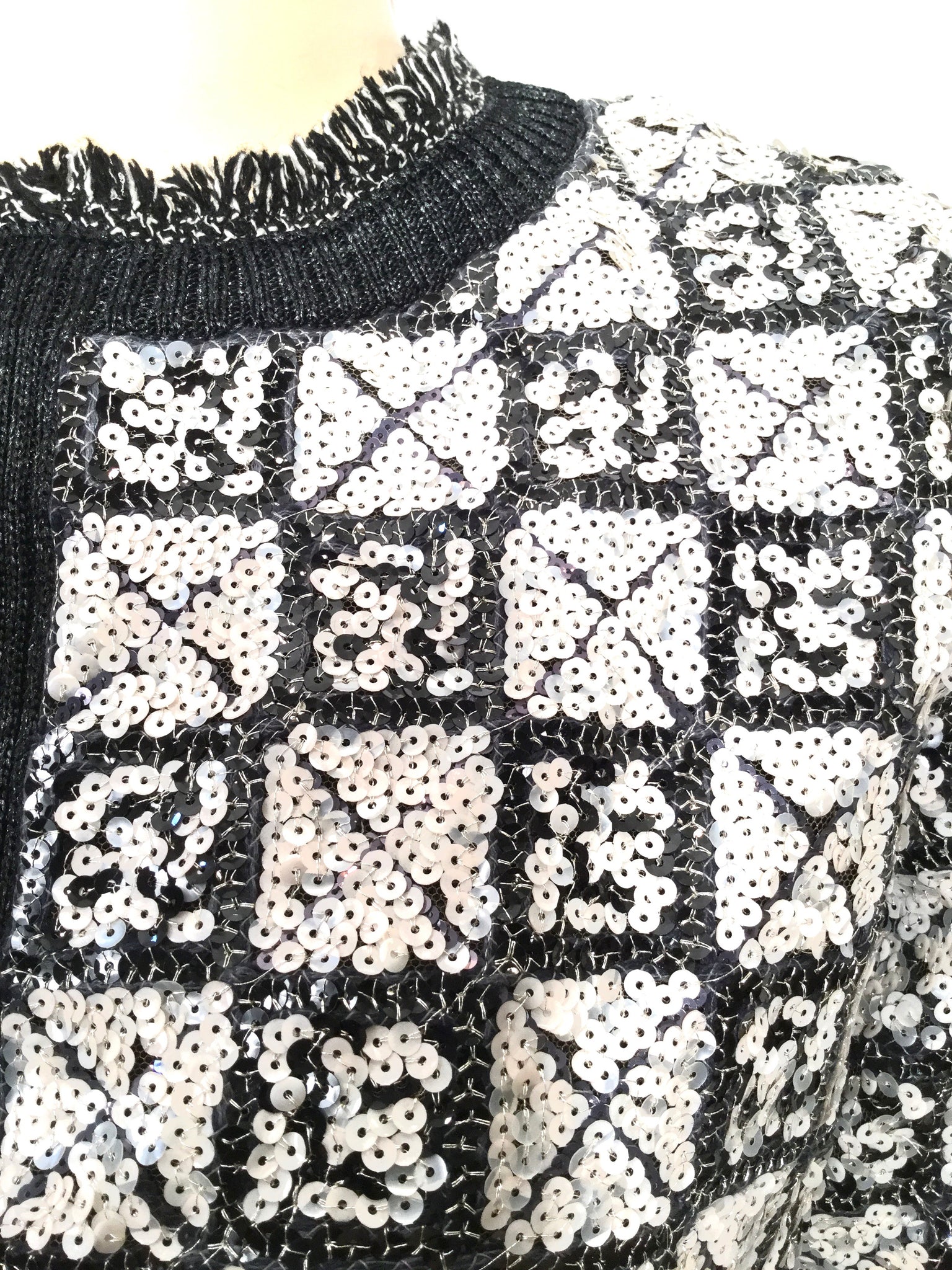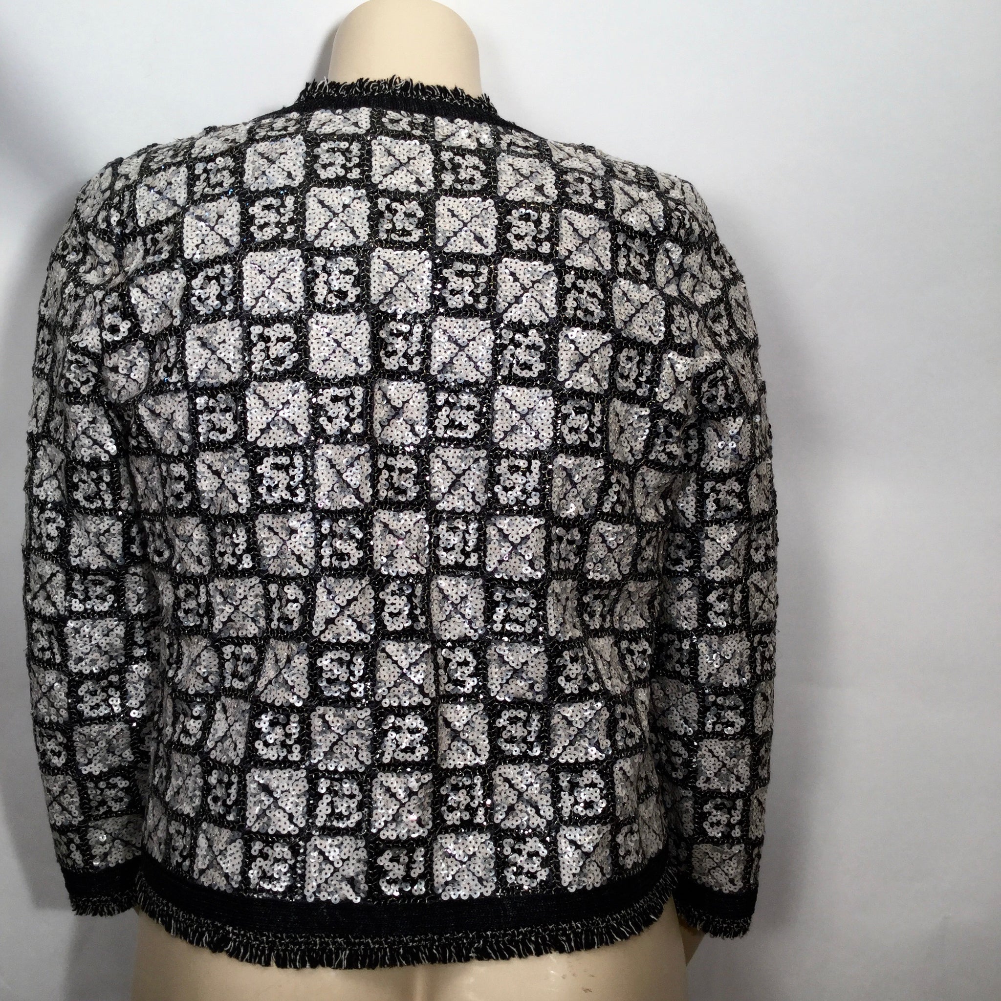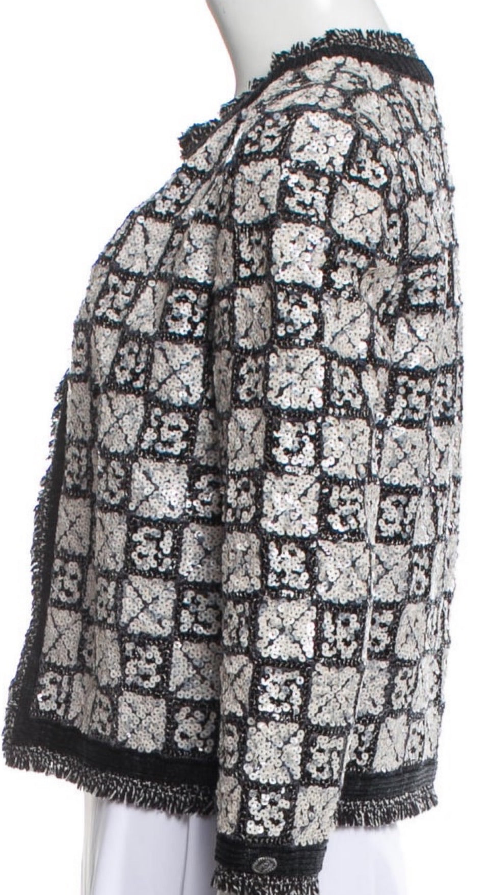 New with tags From the 10P, Spring 2010 Collection. Black and silver/Grey Chanel lightweight knit cardigan with crew neck, tonal fringe trim, sequin embellishments throughout, interlocking CC lion head button adornment at three-quarter sleeve and 3 concealed hook-and-eye closures at center front.