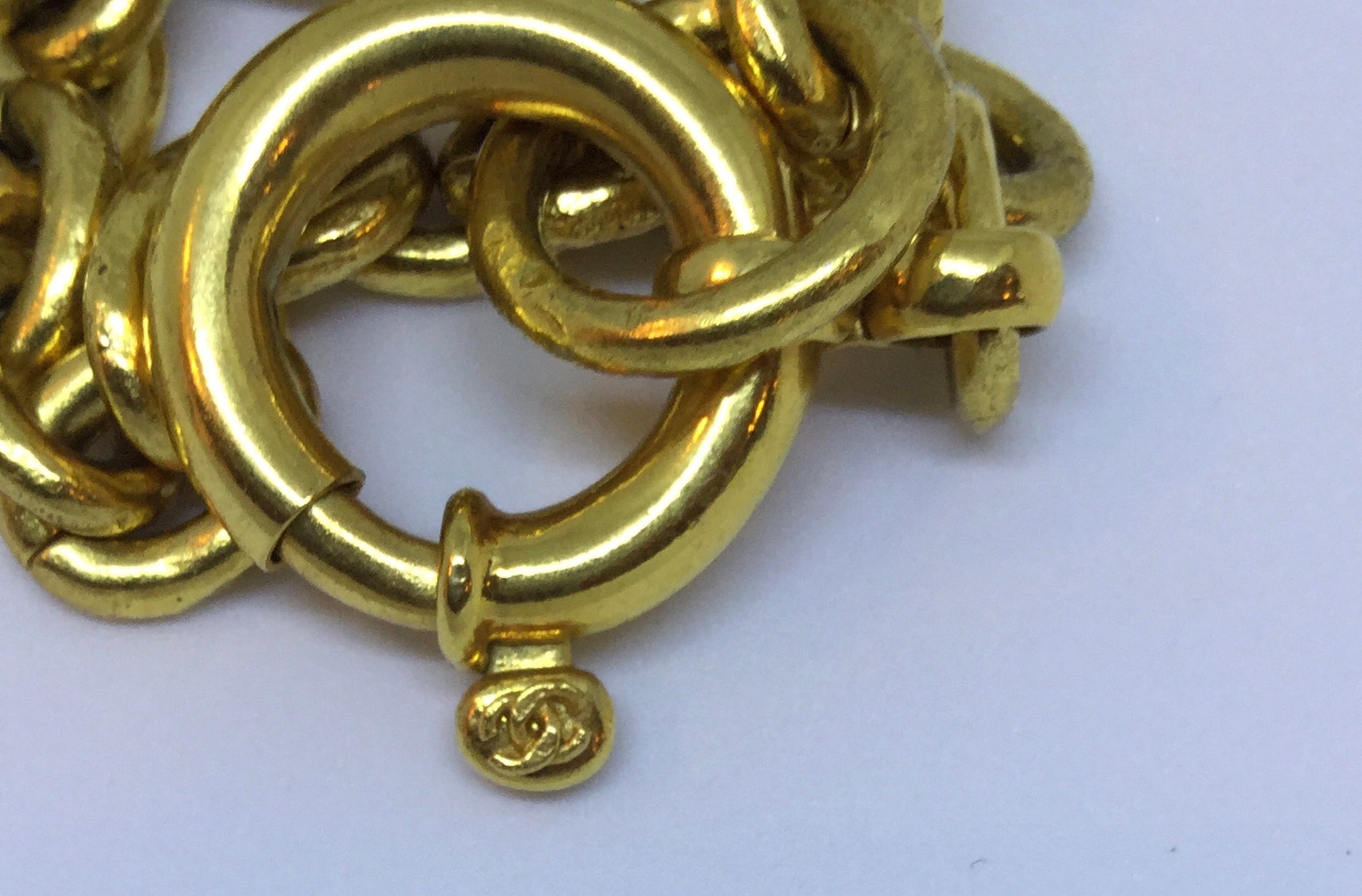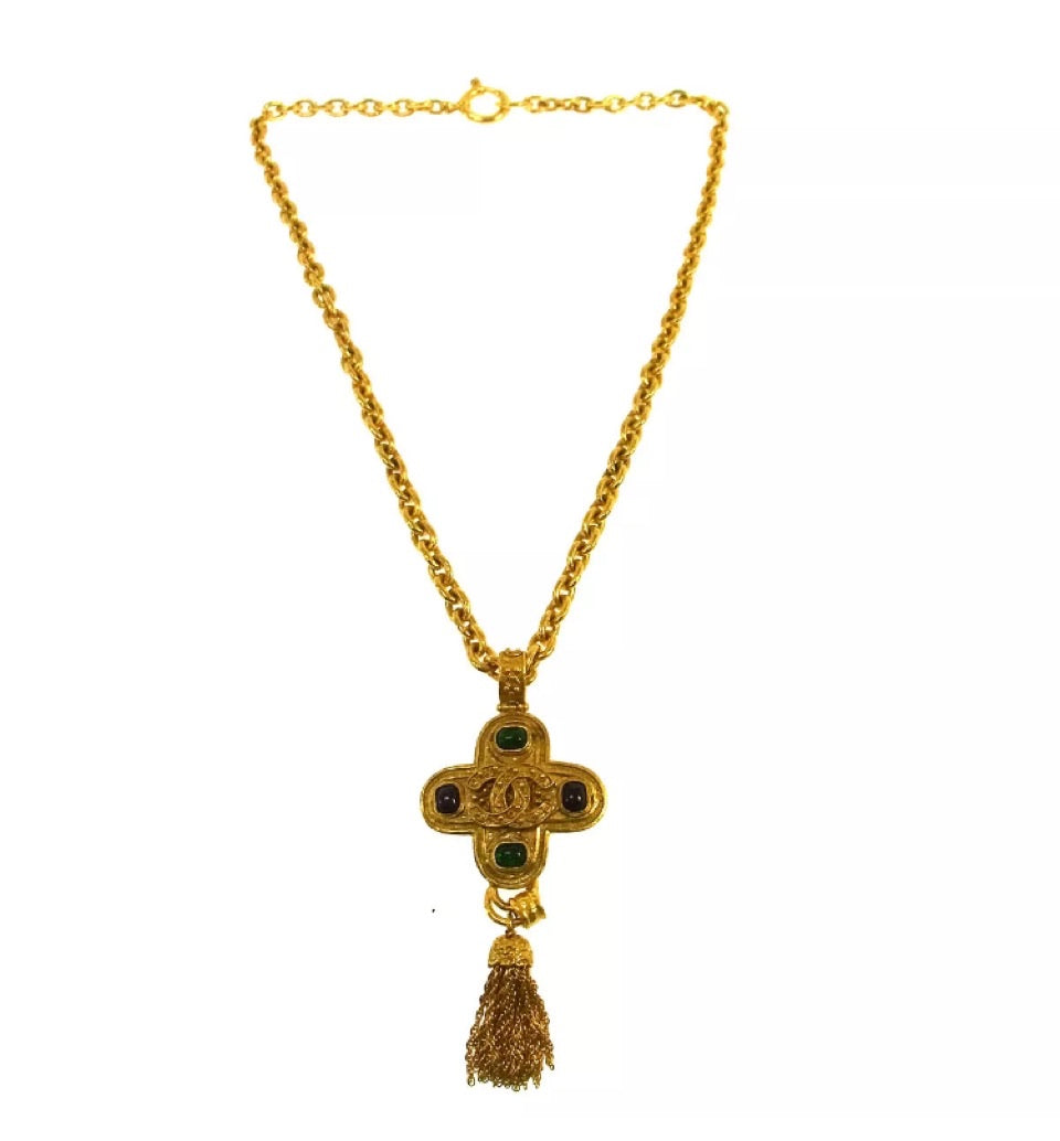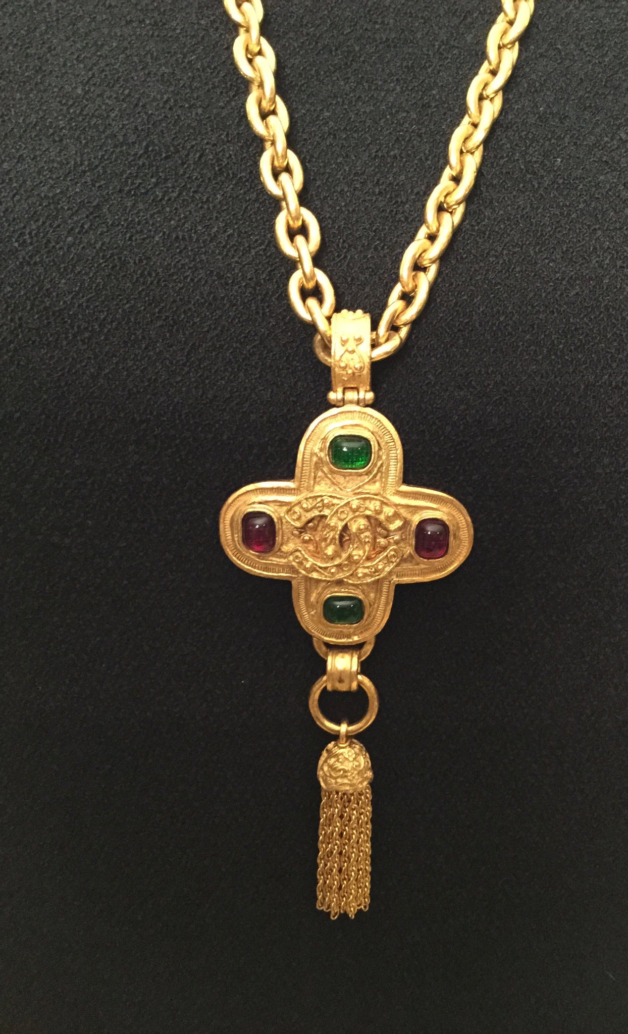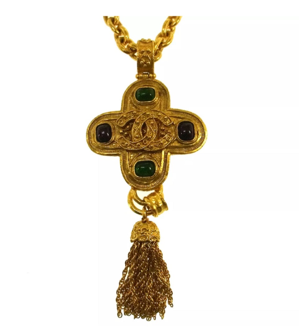 It is a medium/heavy gold chain, with a Chanel cross hanging, which has a large raised gold “CC" logo, 4 pieces of poured glass Cabechon stones 2 red and 2 green, and a tassel hanging low, comprised of tiny gold chain tassels. The clasp has a gold "CC" logo. The Chanel stamp oval is on the back of the pendant. The chain is 26" long, with a 13" drop, 1” ornate CC logo on the cross.