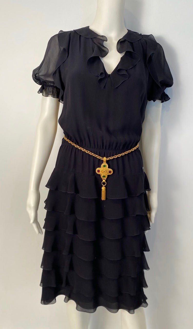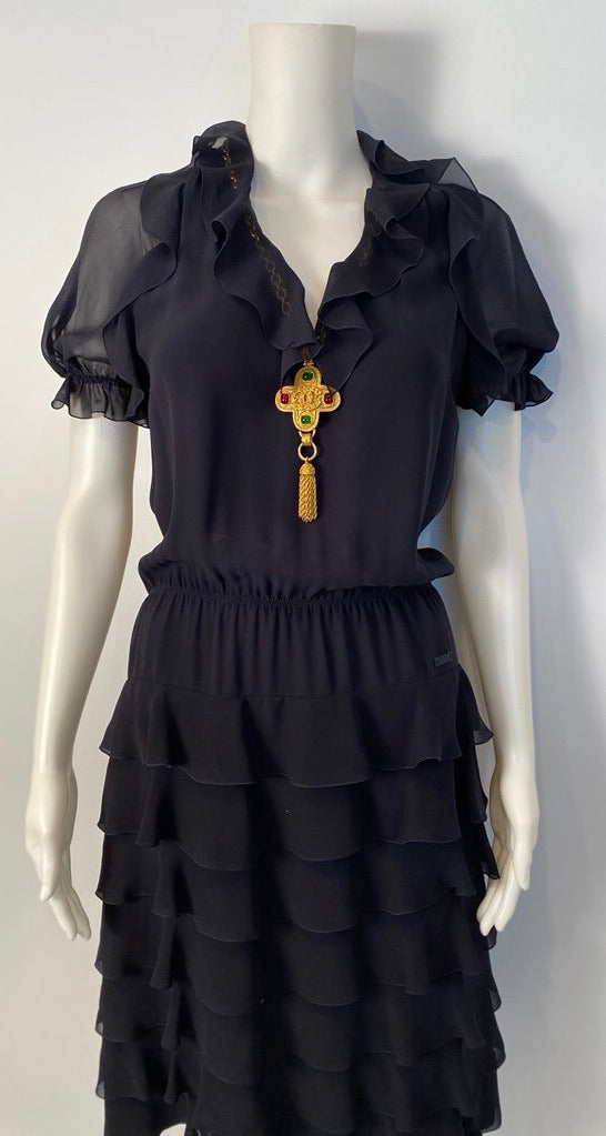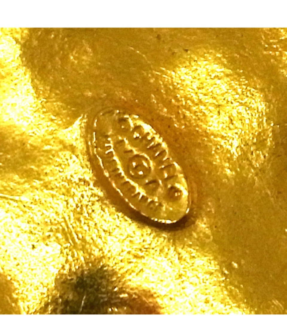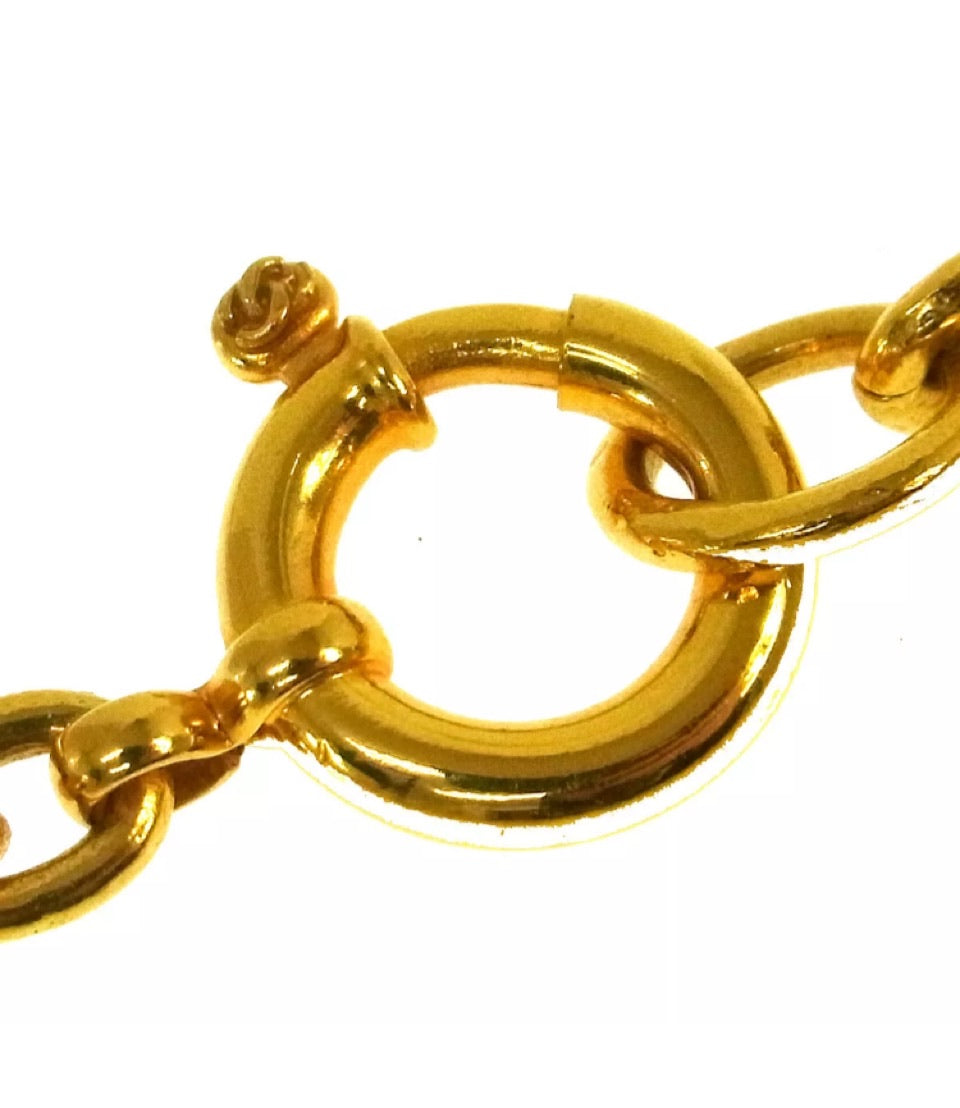 It is a medium/heavy gold chain, with a Chanel cross hanging, which has a large raised gold “CC" logo, 4 pieces of poured glass Cabechon stones 2 red and 2 green, and a tassel hanging low, comprised of tiny gold chain tassels. The clasp has a gold "CC" logo. The Chanel stamp oval is on the back of the pendant. The chain is 26" long, with a 13" drop, 1” ornate CC logo on the cross.
