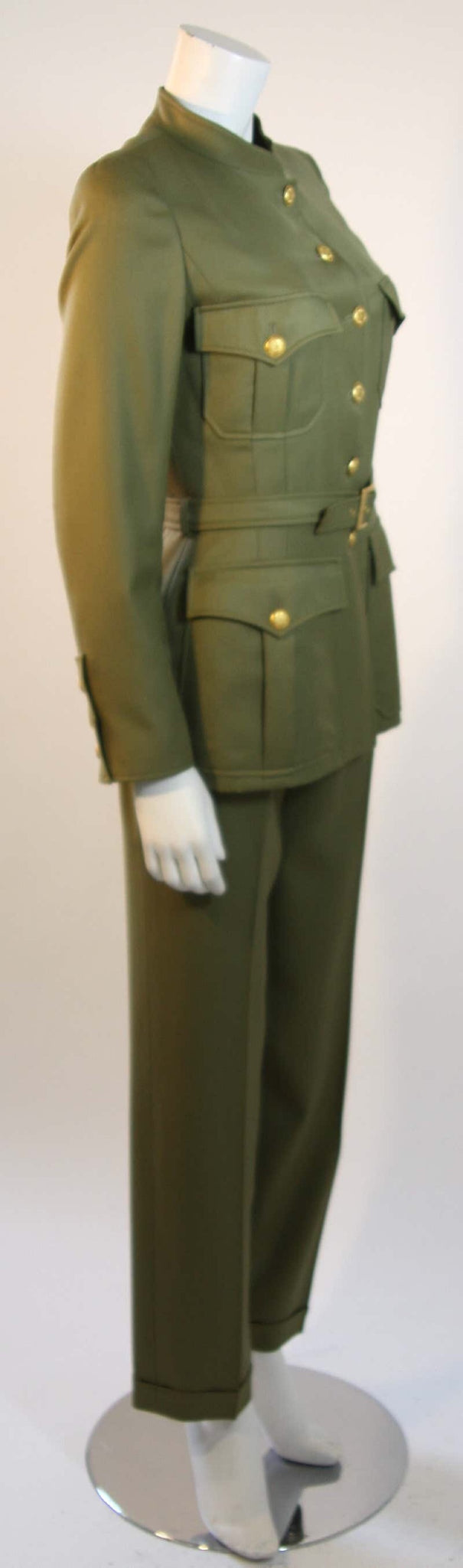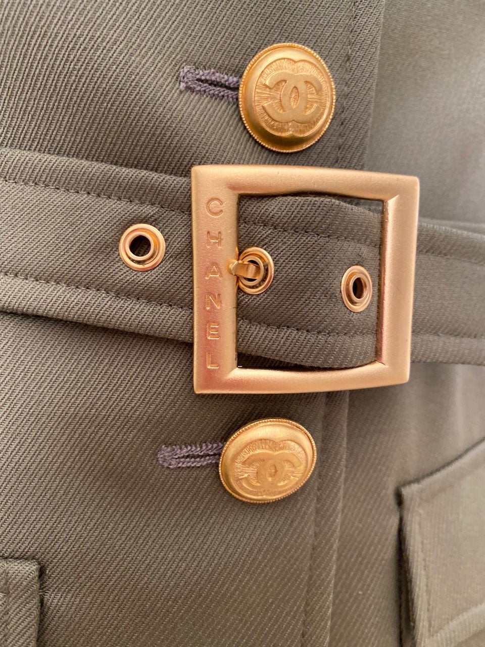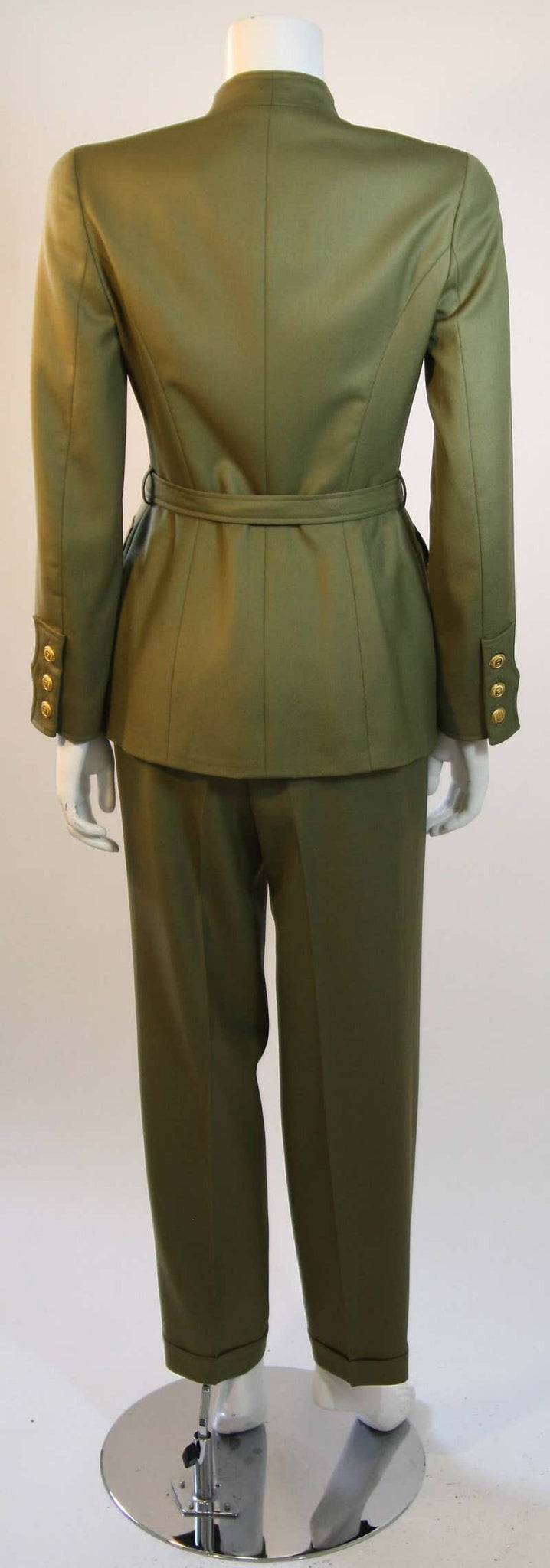 96A, 1996 Fall Vintage Chanel Rare Military Olive Green Belted Jacket Pant Suit Set FR 36