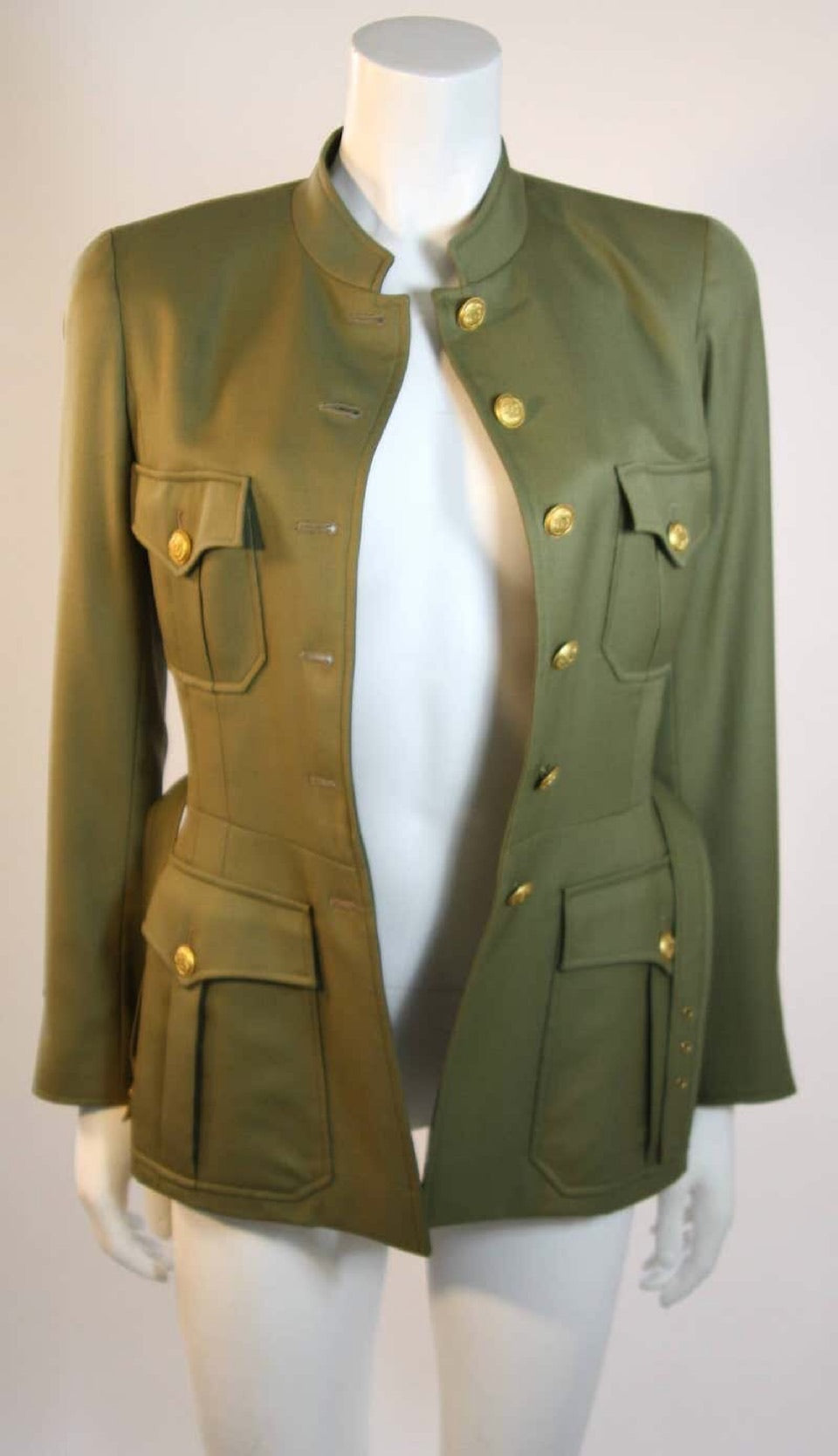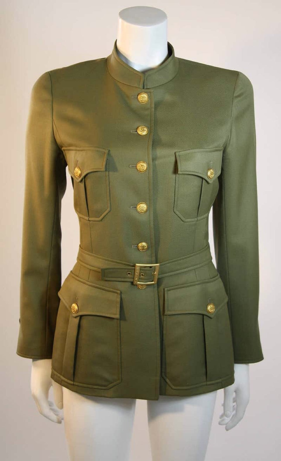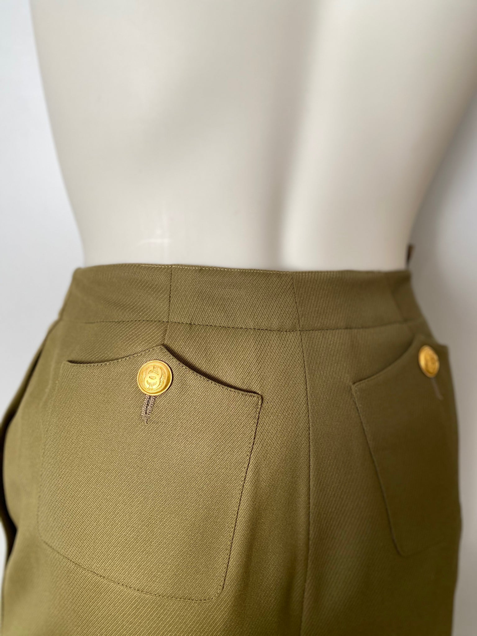 96A, 1996 Fall Vintage Chanel Rare Military Olive Green Belted Jacket Pant Suit Set FR 36