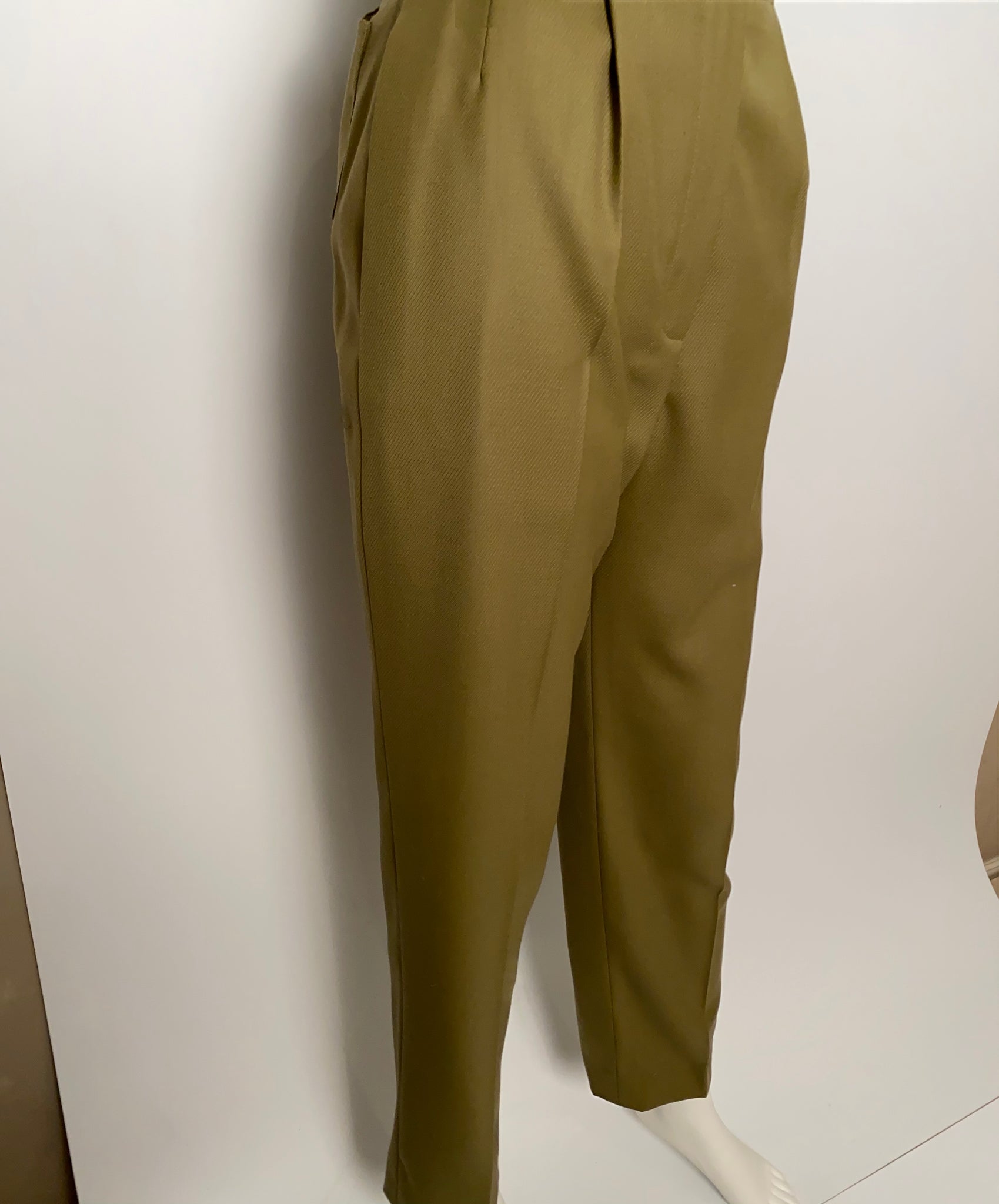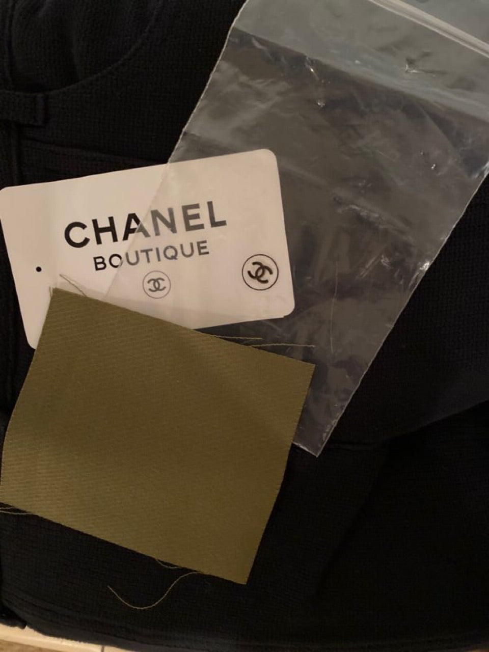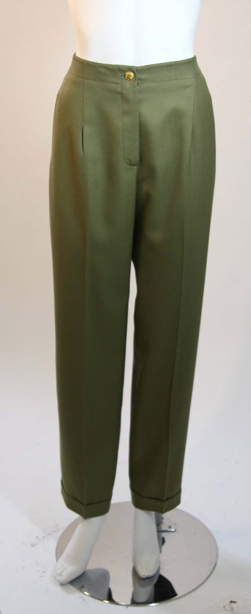 Olive Green with gold buttons and Matching belt. Large “CC” logo on each gold button and there are an amazing total of 19 of these buttons! The pants have slim straight legs, very flattering. The jacket is fitted at the waist and it has a gold chain around the bottom to make sure it hangs evenly. Both Jacket and Pants are fully lined with “CC” logo silk.