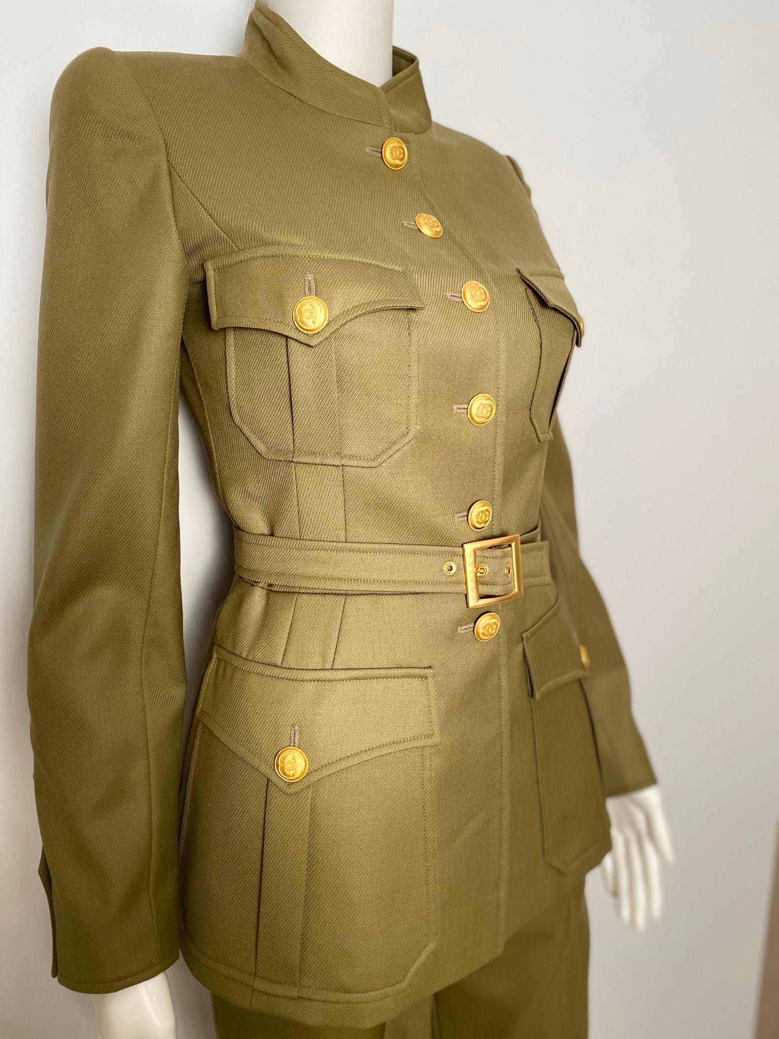 Rare! Vintage Chanel 96A, 1996 Fall Military Jacket Pant Suit Set. 3 piece set includes jacket, pants, belt with buckle.