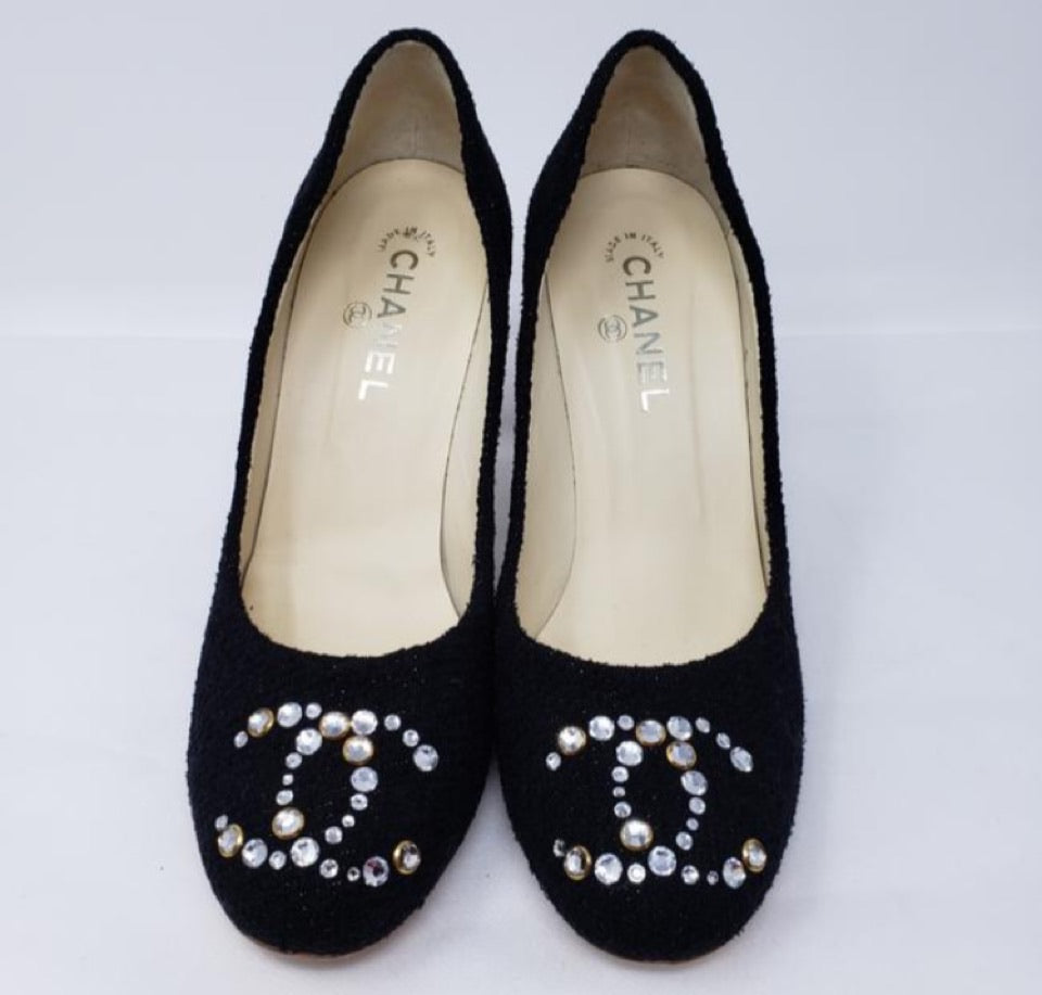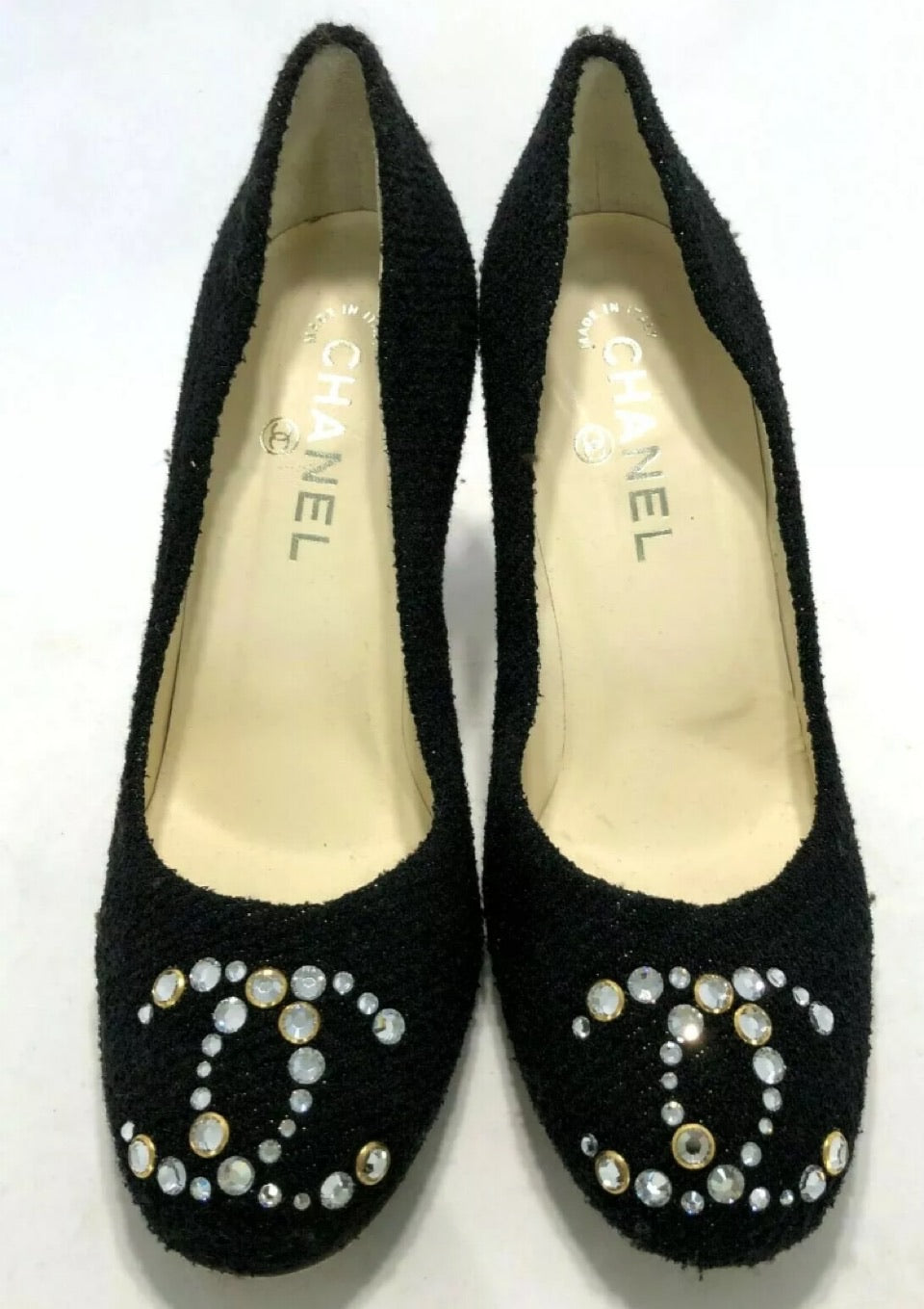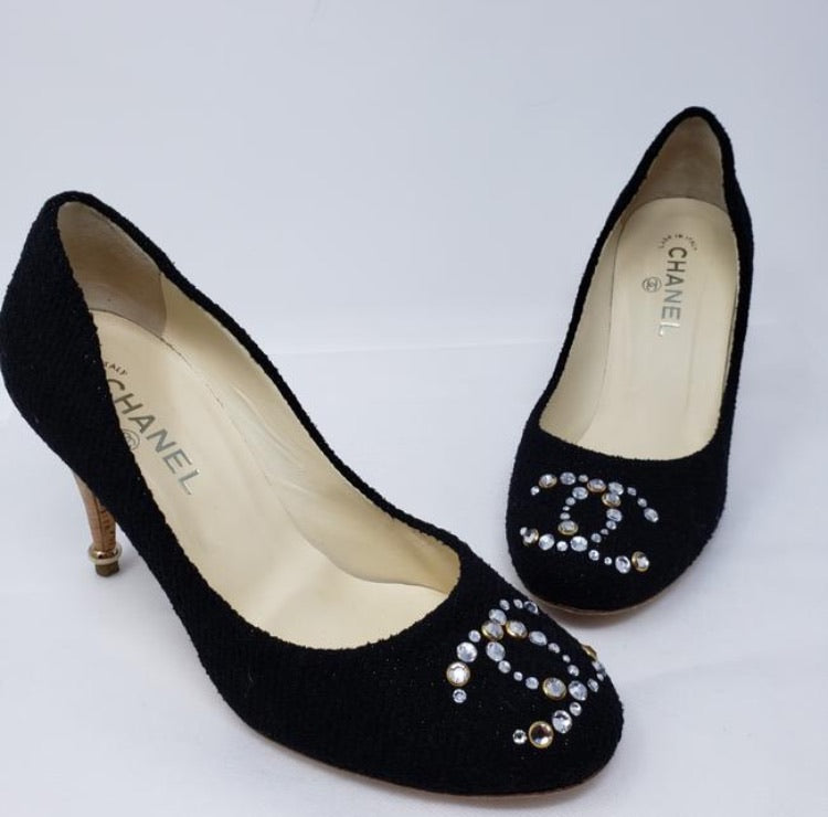 Chanel 12C, 2012 Cruise Resort black wool interlocking Strauss crystal CC logo heels pumps. These feature a polished cork screw heel and bottom. Black wool with subtle sparkle in the fabric when the light hits.