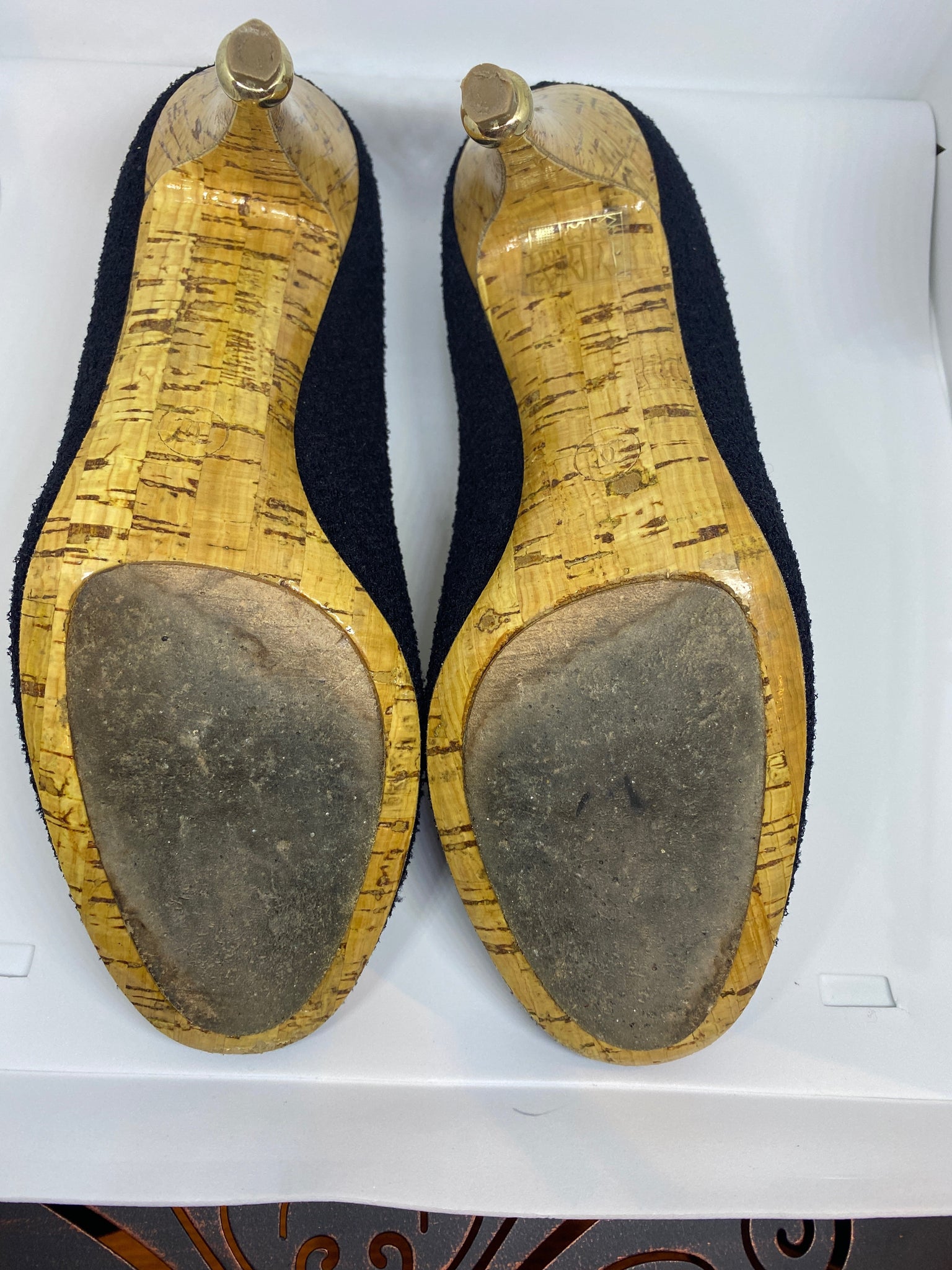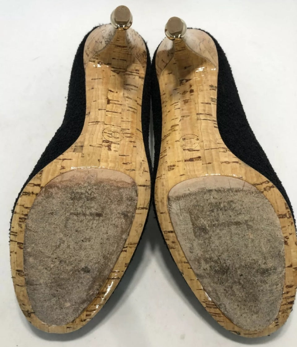 Chanel 12C, 2012 Cruise Resort black wool interlocking CC crystal cork screw heels pumps US 7.5/8