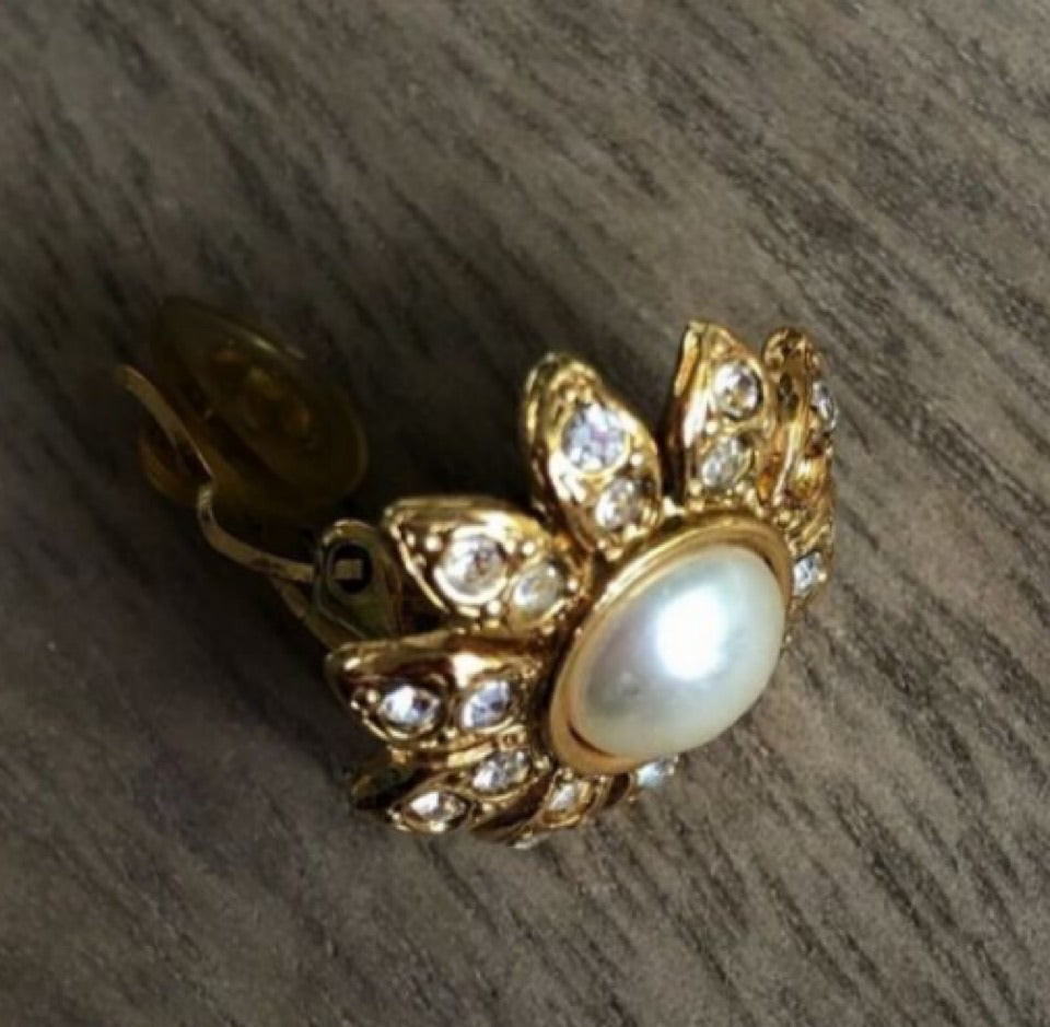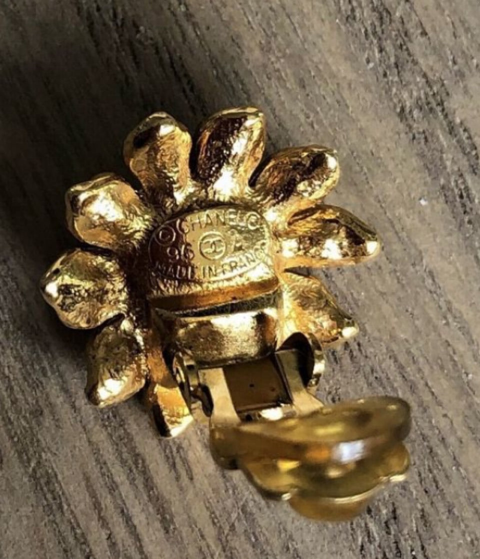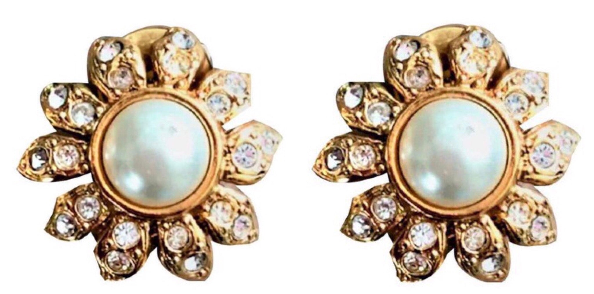 Chanel Vintage 96A, 1996 clip on earrings, gold pearl camellia in the shape of a daisy with crystals!
