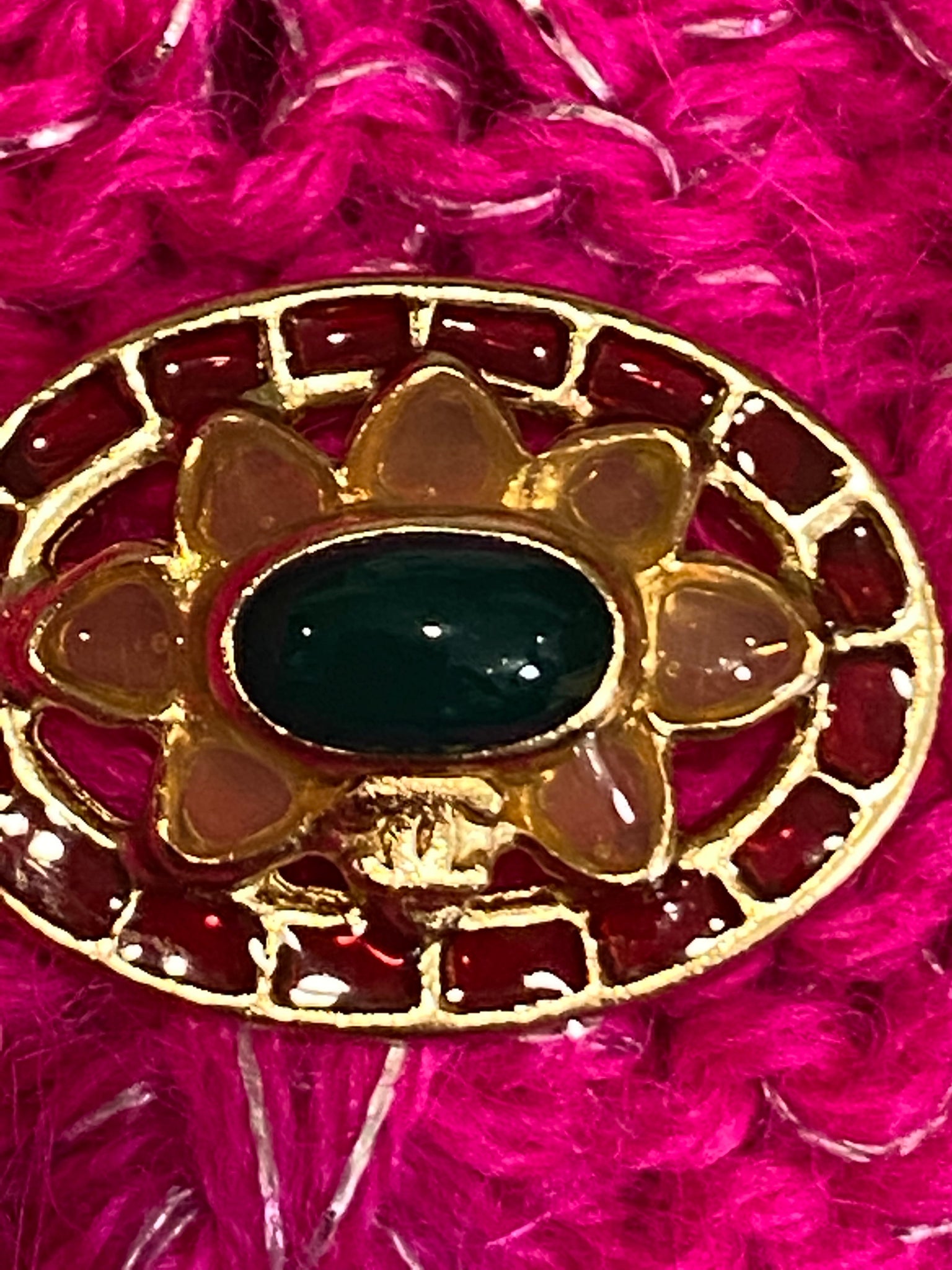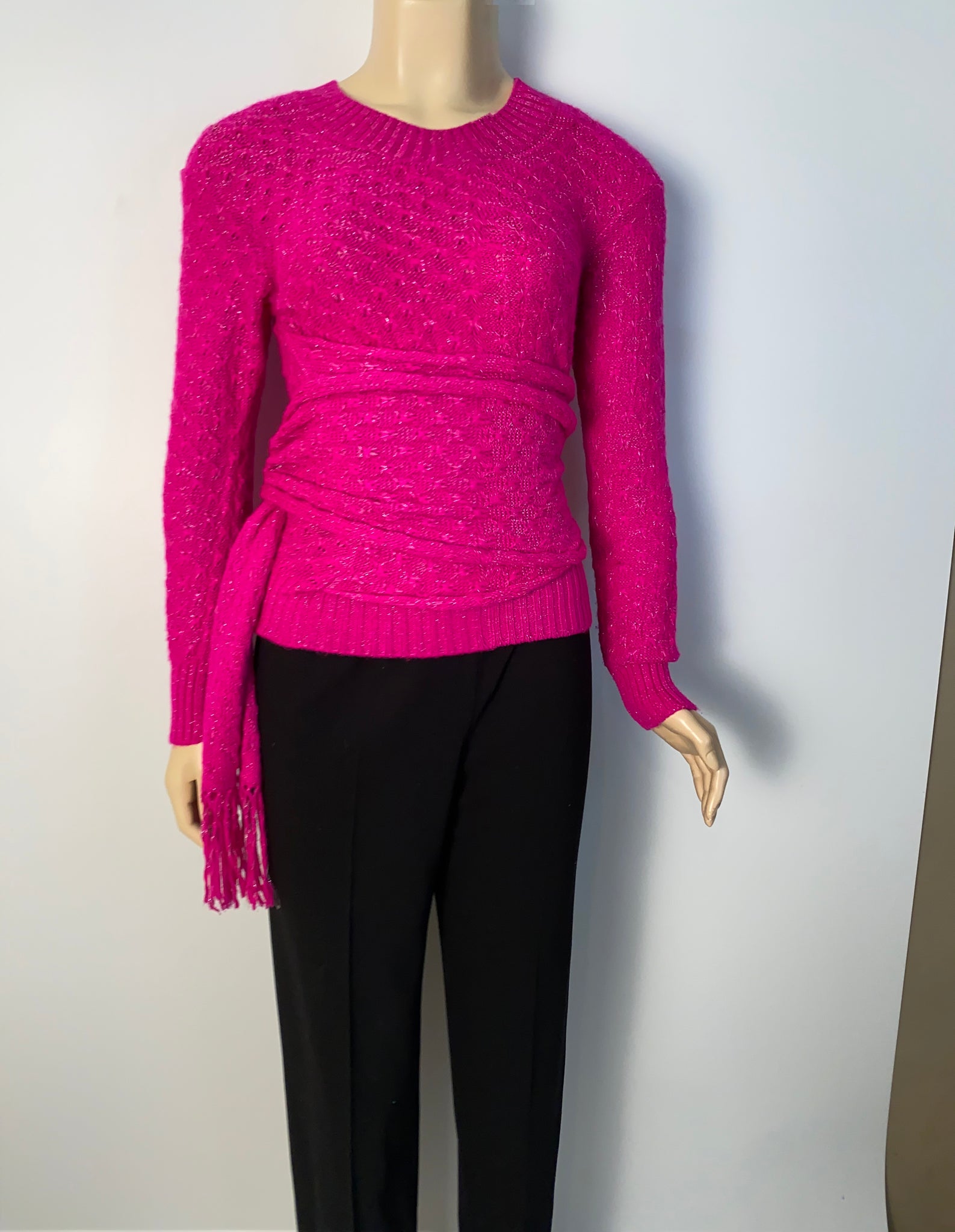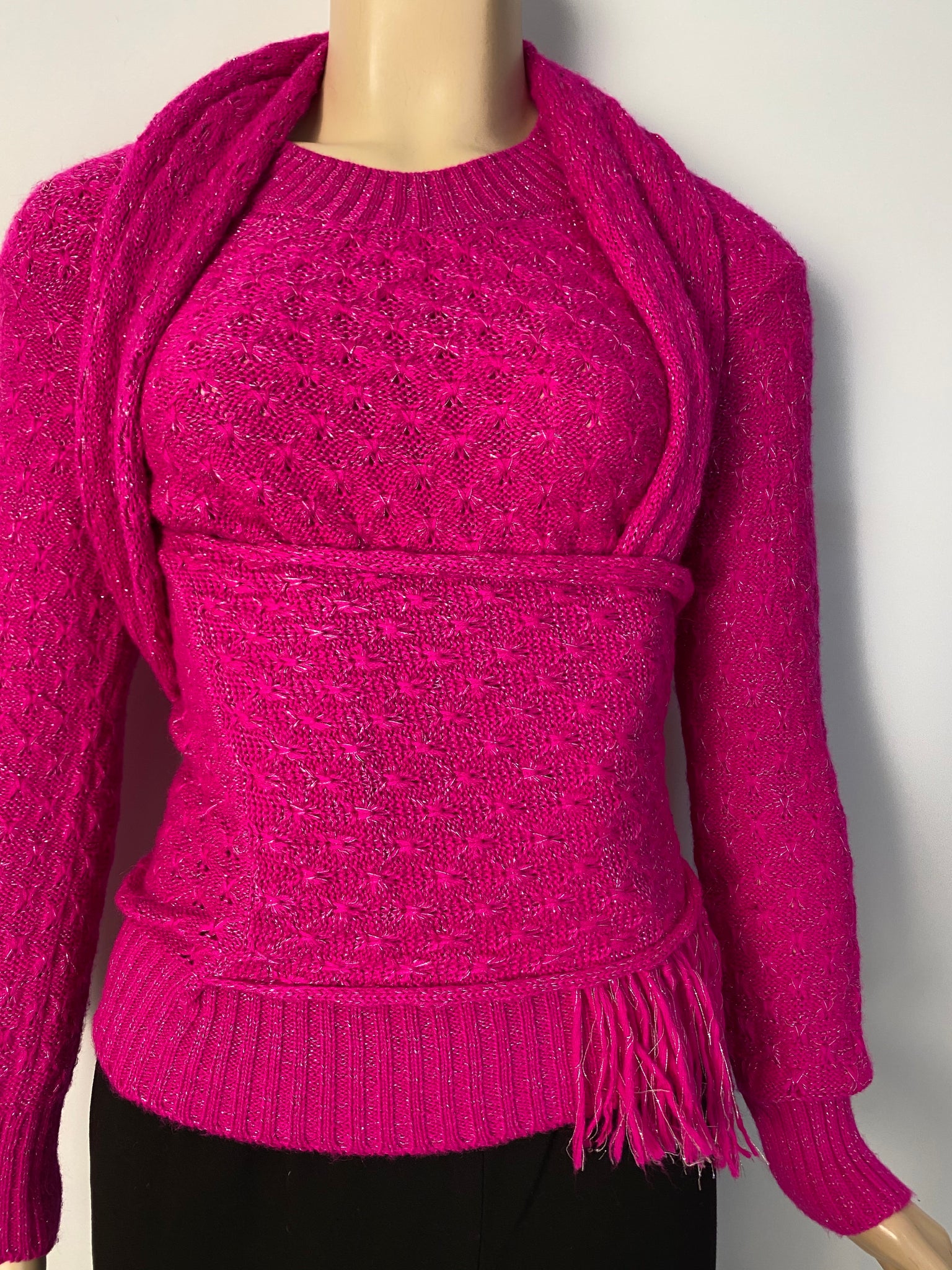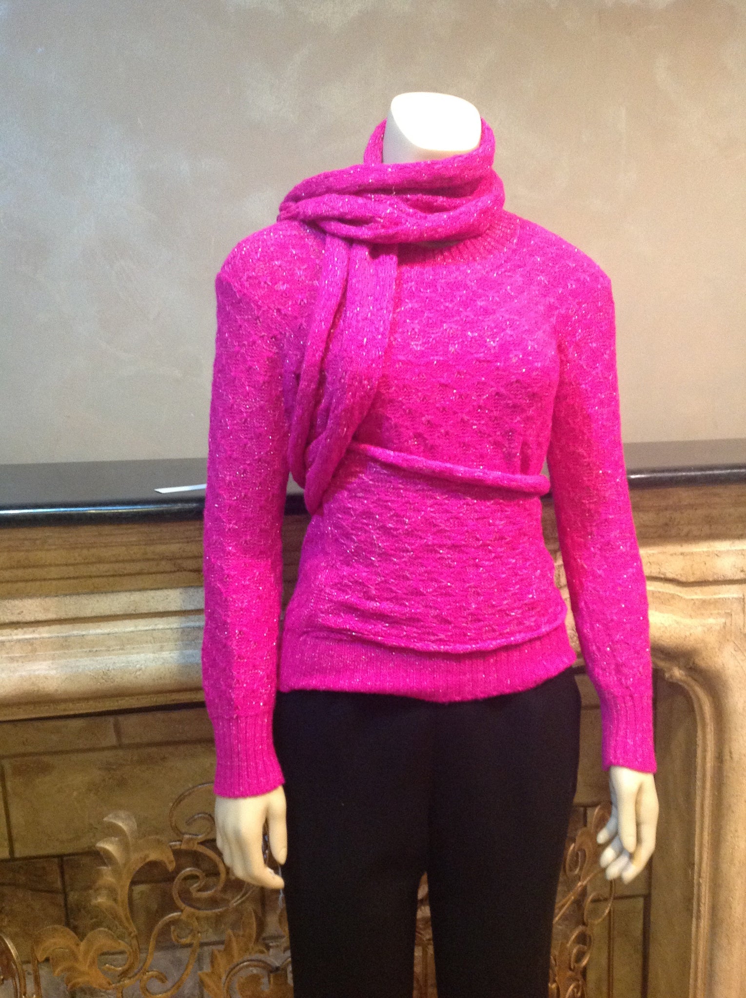 Soft pink Alpaca Chanel sweater with attached scarf that can be worn to create many different looks! Has a subtle sparkle when the light hits. Scarf is attached to the right side l, it measures 10” wide by 69” long (yes 69” long). Metal oval which is on the end of the scarf 3/4” wide with 3 colors of poured glass and a gold CC.