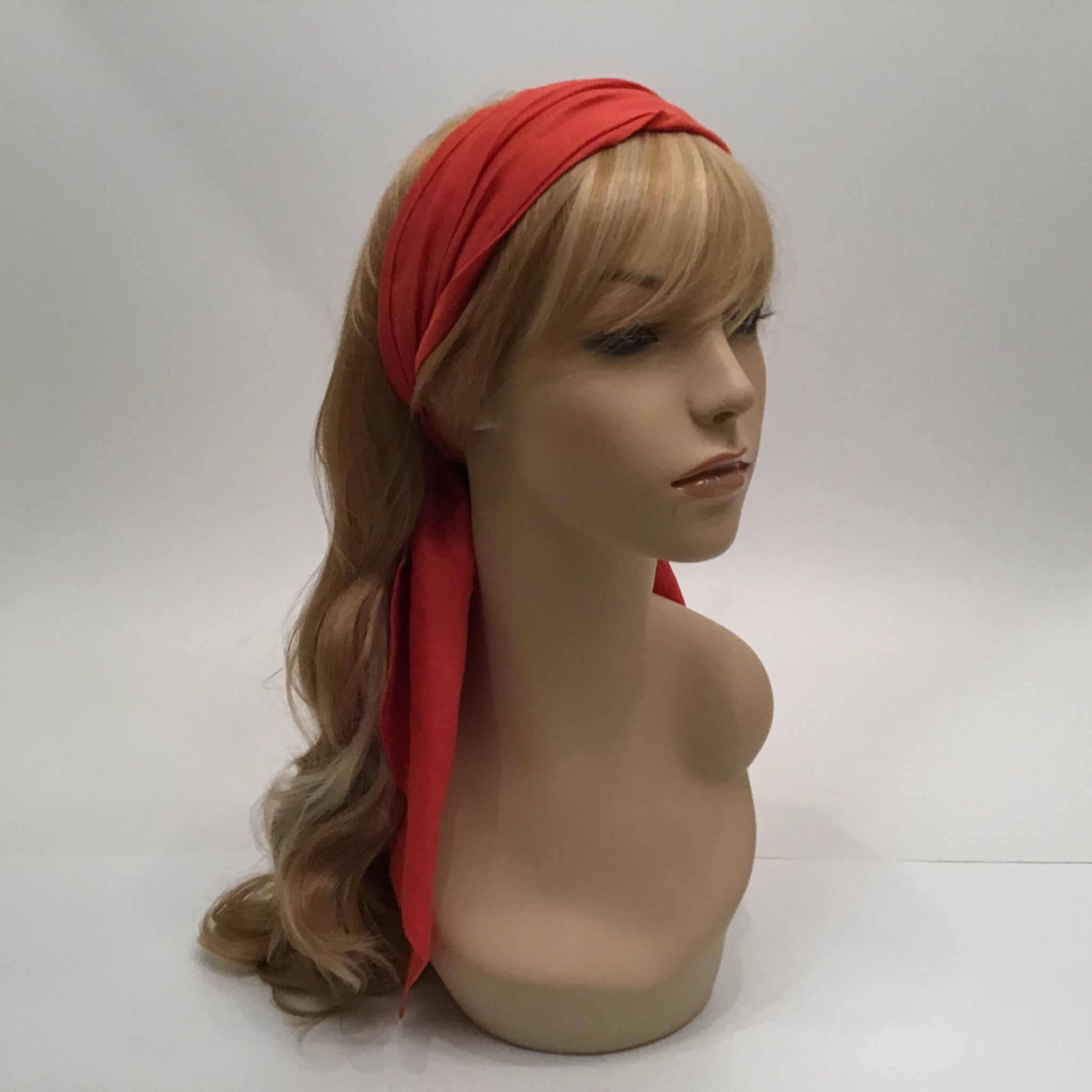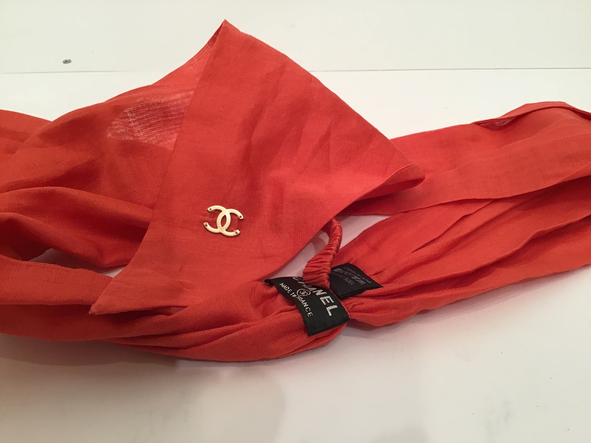 This Orange Chanel 08C, 2008 Cruise Resort Runway headscarf has a pleated center, and a subtle elastic band connecting the two sides so it will stay in place for you to wear creating multiple looks. The first picture has the band going under the hair, with the tails of each end tying at the neck to form a matching scarf forming a neckerchief. It is lightweight cotton, and has a metal "CC" logo at the end of one side. Use your imagination with this one, as there are SO many ways to wear it. If you fold it in half lengthwide, it meassures 27".