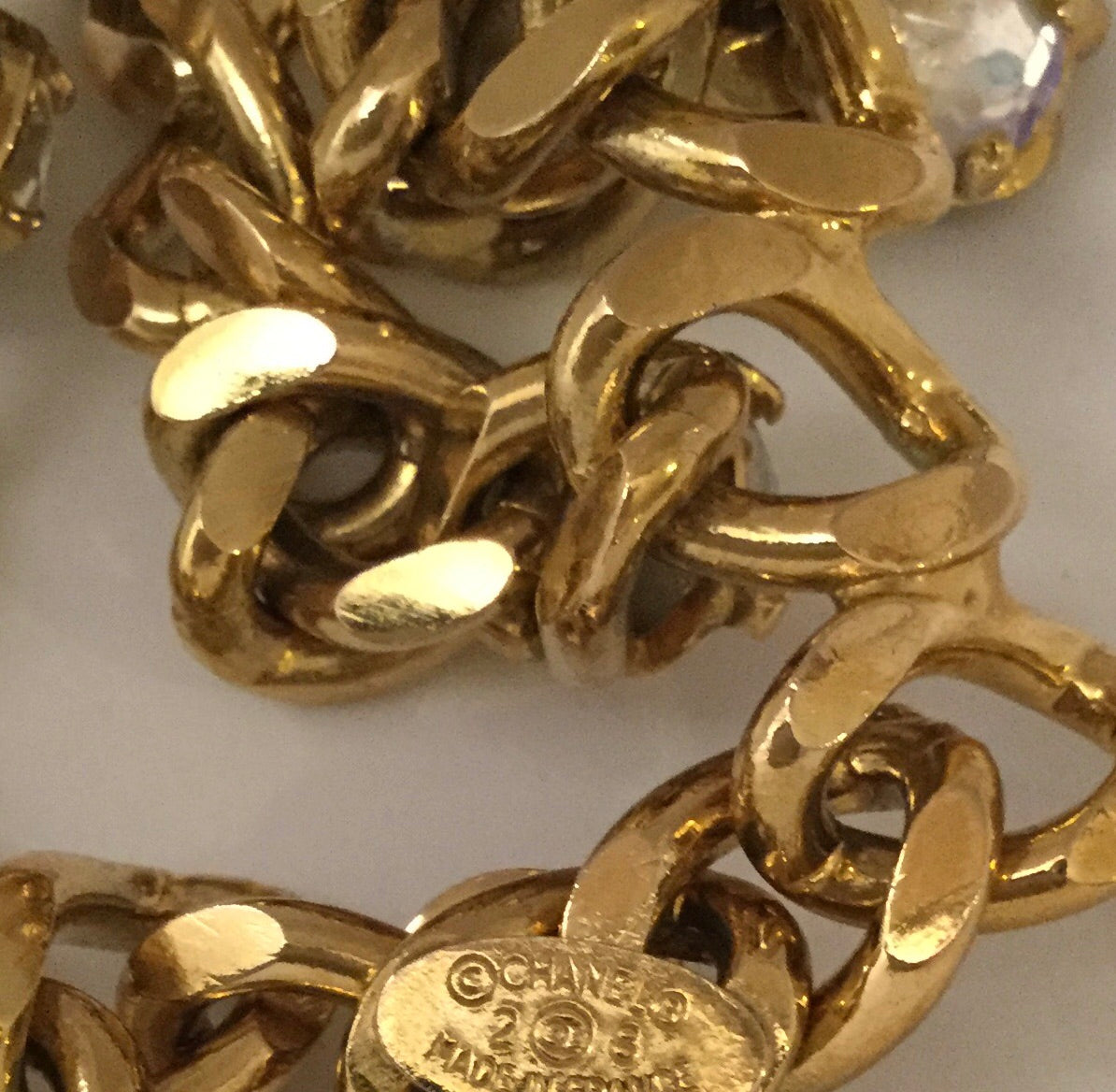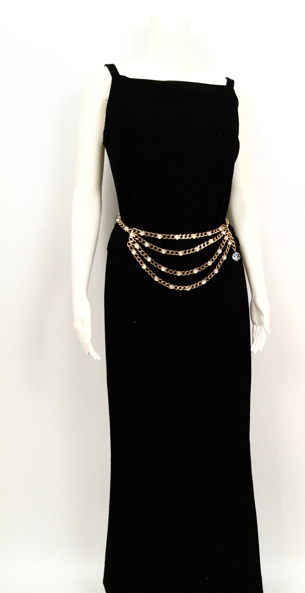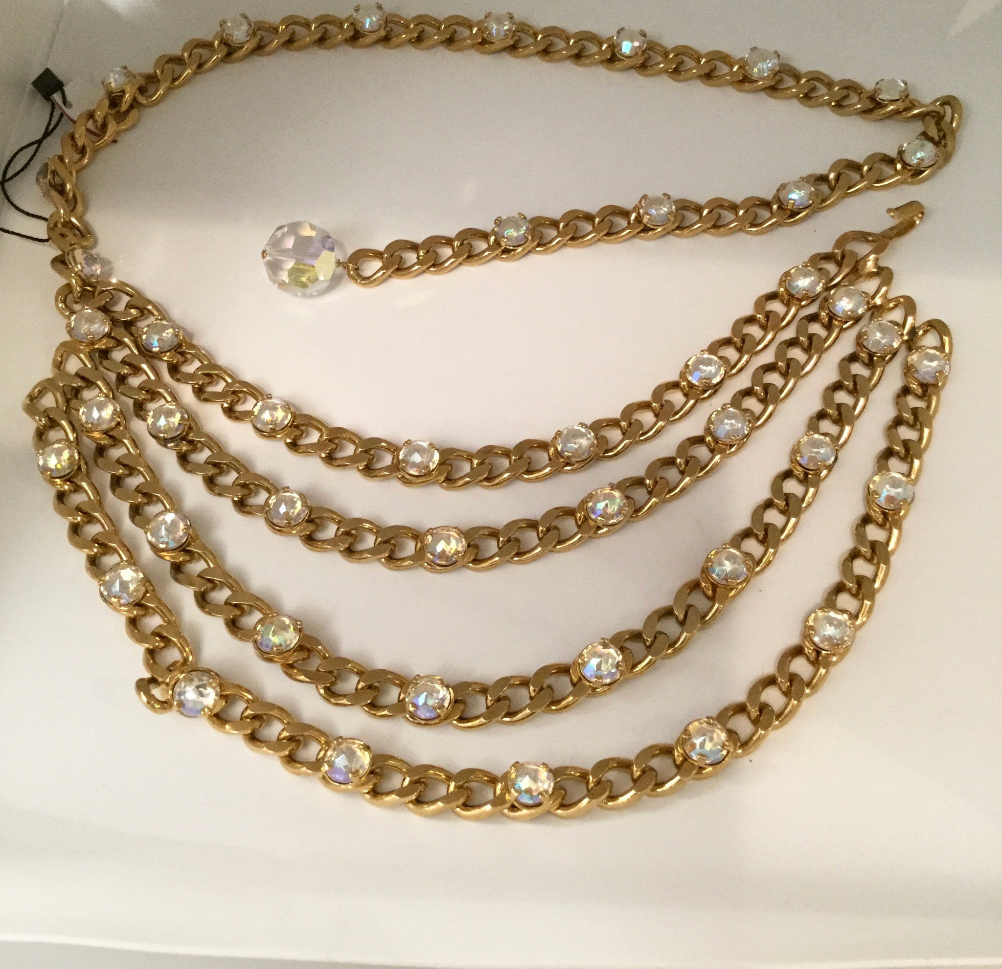 A rare find! Fabulous Vintage Chanel belt from approximately 1989, Collection 28. It has 4 rows of heavy gold chain in the front, and a single chain around the back. There are 43 faceted crystals, ending with one large cherry-size round crystal . It fastens with a hook which you can put through any of the chain links, up to 30" long. It has the Chanel identification oval on the back.