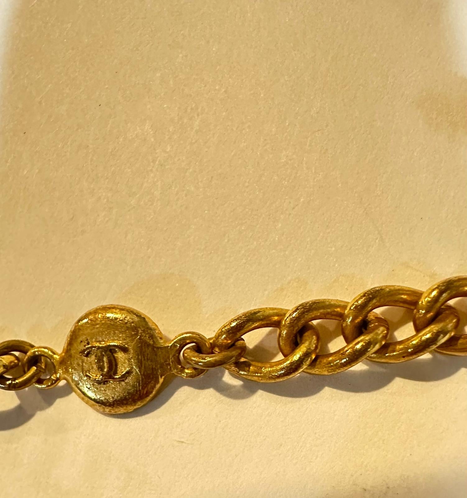 This fabulous vintage Chanel 98P, 1998 Spring necklace has no clasp-it slips over your head. It is 37" long, gold metal chain with red and green poured Gripoix glass beads, faceted crystal beads, and freshwater pearls, ending in a 1 3/8" gold disc. The identification oval is on the chain “CC" on one side, oval on the other.And on the back back of the disc is the identification oval which says "98P" and "Chanel, Made in France.