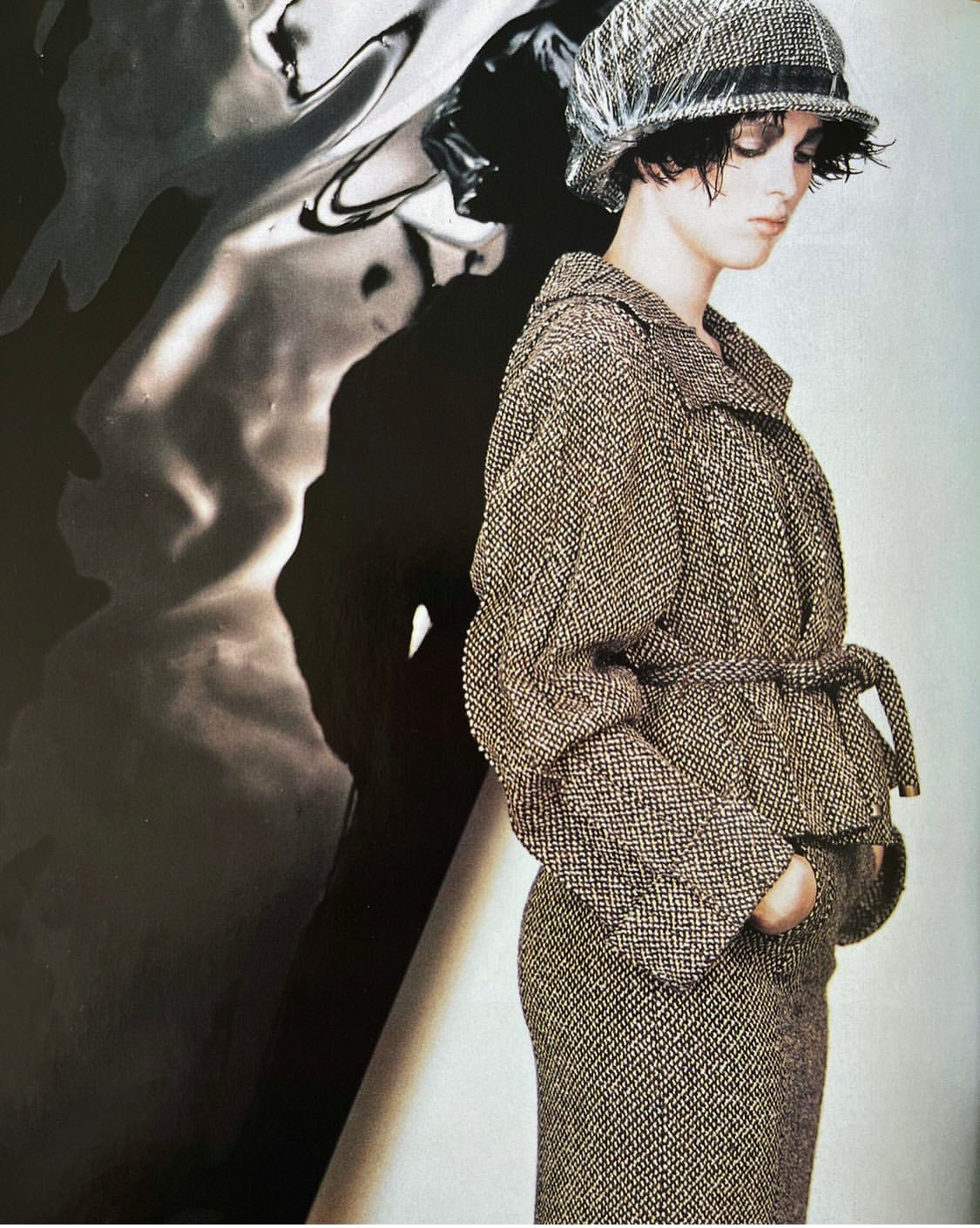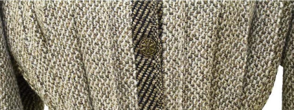 This is a heavy wool tweed 98A, 1998 Fall Winter Vintage Chanel Boutique suit with an "accordian" jacket, and a long skirt. Beige, ivory, brown with a touch of black. The skirt zips up the back, with no elastic, pockets, etc. It has a 17" slit at the bottom with 4 Chanel buttons. It is fully lined. The jacket is all pleats, boxy fit, with 4 Chanel buttons for closure. It's a thick fabric, unlined.