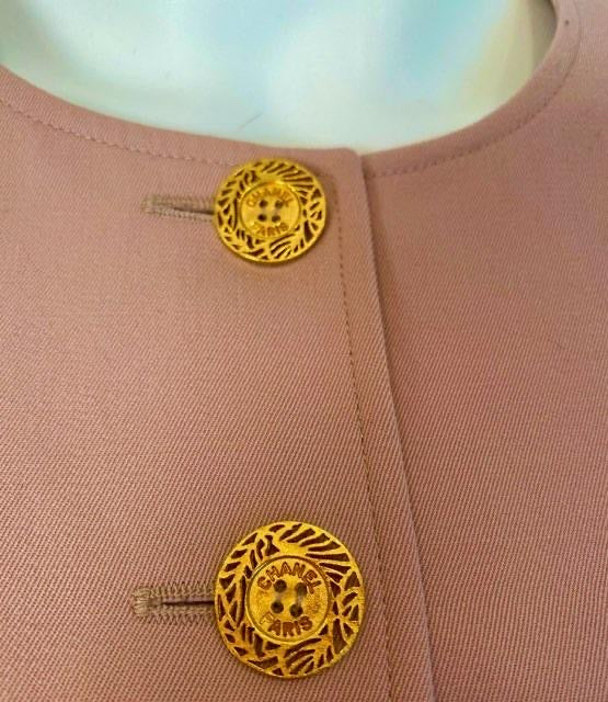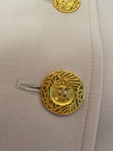 This jacket has 4 patch pockets on the front, 2 large, 2 small. Fully lined with “CC” logo silk. There are 10 Chanel gold buttons, 4 on the front for closure, and 3 on each sleeve.