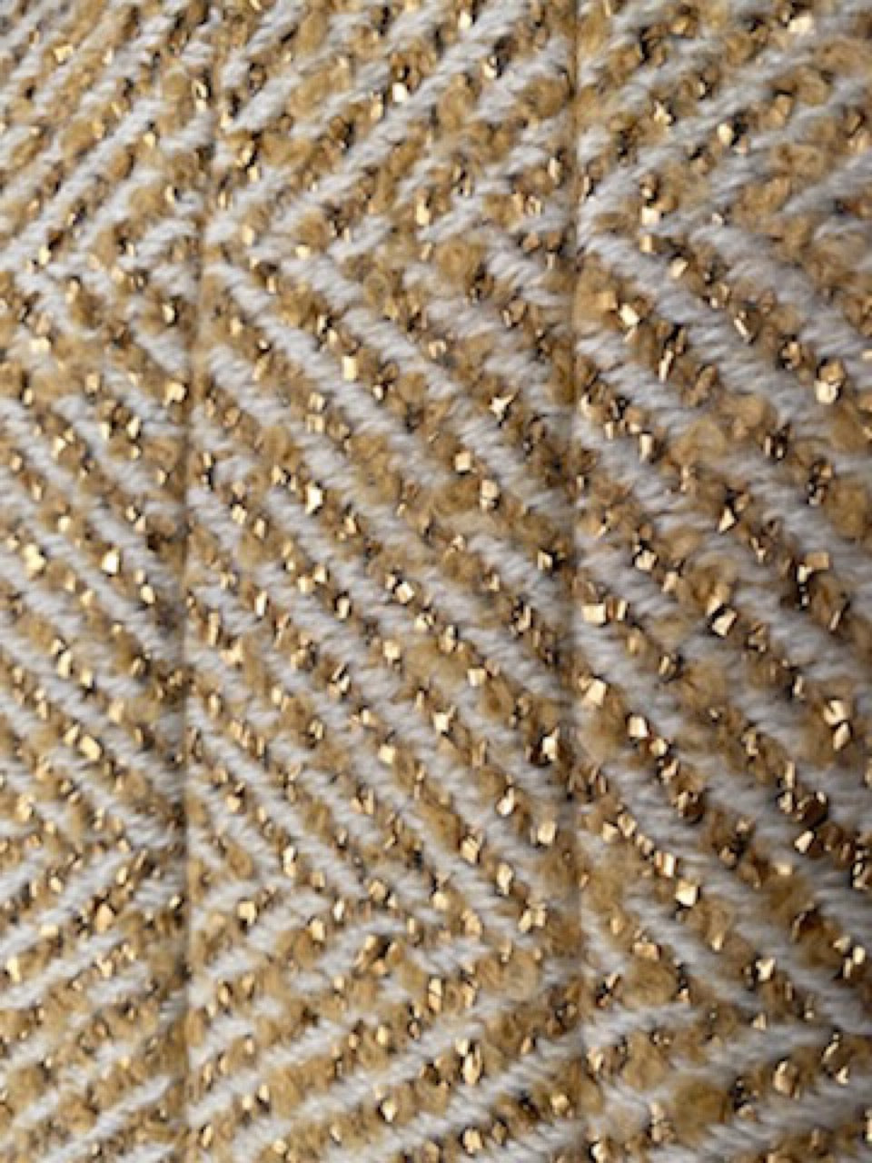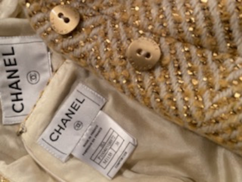 It has a flattering skirt with no Waistband and a hidden back zipper- no pockets, no gathers, no pleats, just a nice smooth fit. The jacket has a slightly tapered waist, very small shoulder pads and 4 gold buttons on the front which say "Chanel"(twice on each button). The background is ivory stripes alternating with Sections of gold stripes going in opposing directions to flatter your figure, and they are gold yarn with plenty if nylon gold threads to add some sparkle on both pieces. Both pieces fully lined and the jacket has Chanel's famous chain around the bottom to make sure it hangs evenly. There is a metal "CC" at the skirt waist.