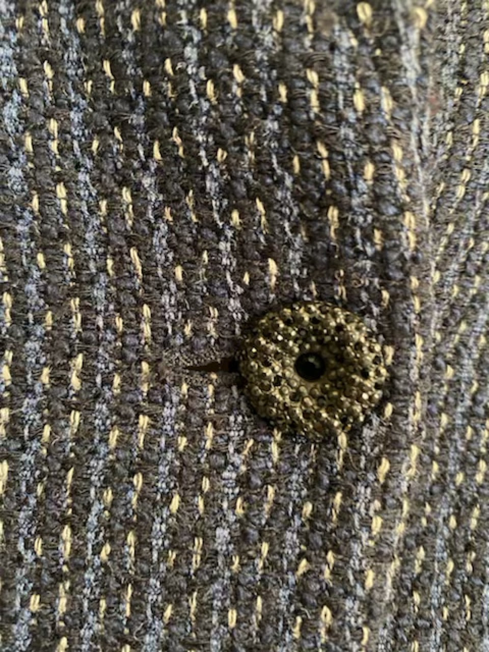 Composition: 70% wool, 15% silk, completed by  linen, poly, and cotton, creating a beautiful textured  weave with 2 shades of navy blue and some subtle white.