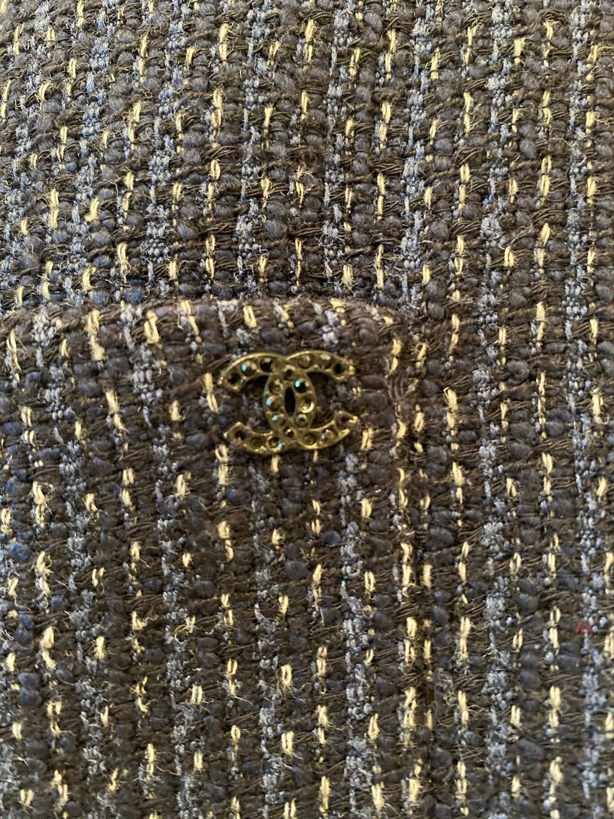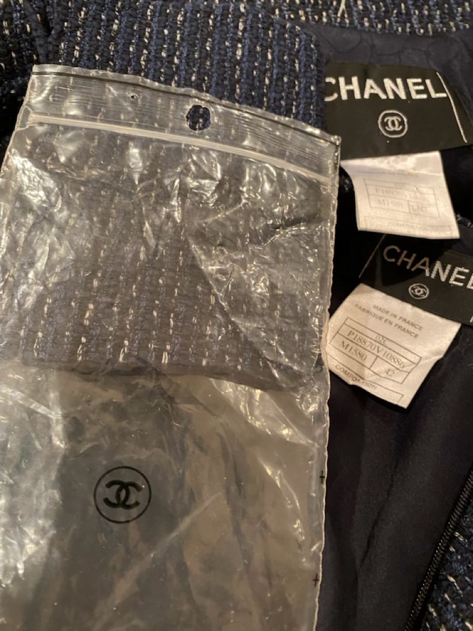 Blue Chanel A-line skirt suit and short jacket. Original Chanel fabric sample packet is included. From the 02C, 2002 Cruise Resort collection. There are 2 CC logos filled with black crystals on the wrist, and on one of the skirt pockets.