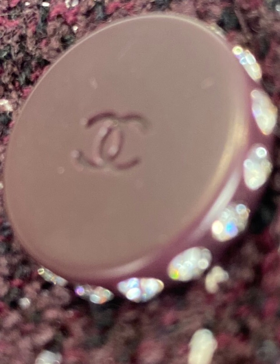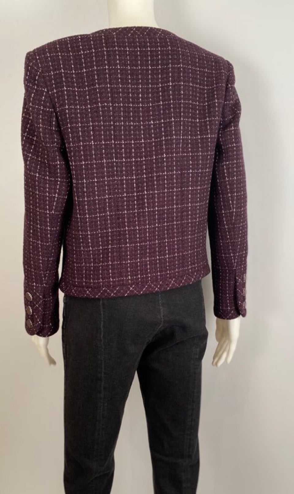 The maroon Color is created with shades of Maroon, purple, and black. In addition there are shiny silver threads of 1" squares that shine when the light hits. There are 11 Chanel buttons, 3 on each sleeve, 5 for closure. Each button has 15 shiny crystals around the sides and a"CC" logo on the top. Fully lined and has the famous Chanel chain around the hemline to make sure it hangs evenly.