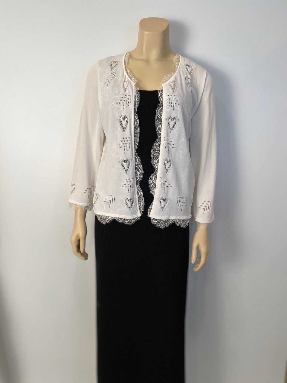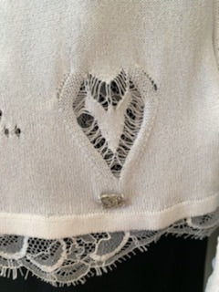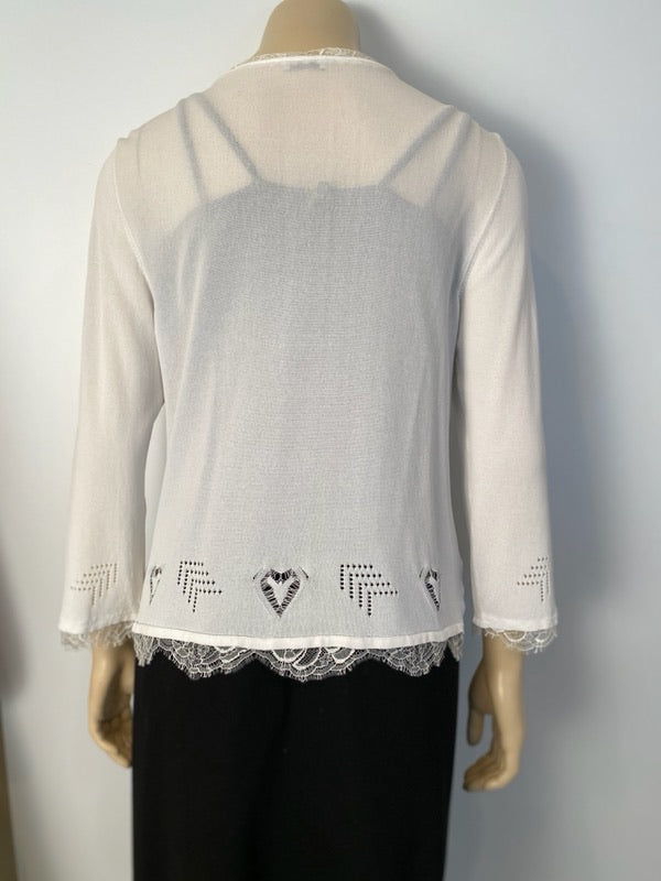 Chanel 06P, 2006 Spring very lightweight white lace trimmed geometric cut out cardigan sweater. It is meant to be worn open, so it has no snaps or buttons. It has a small “CC” logo covered with crystals near the bottom. Scalloped lace trim along all the edges.