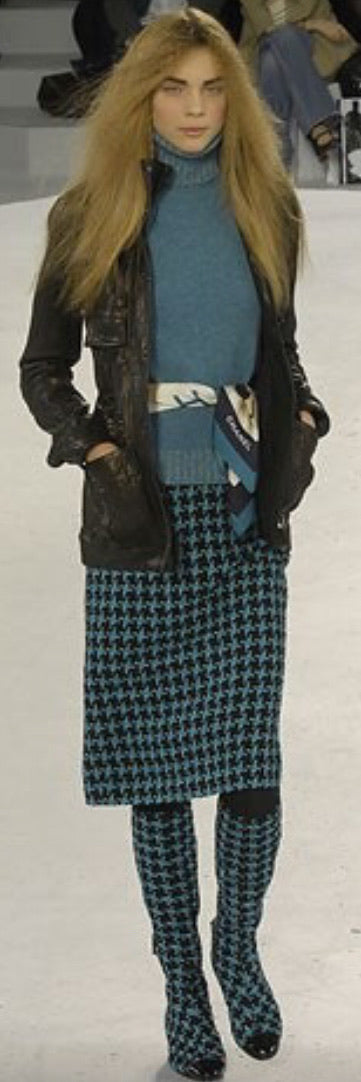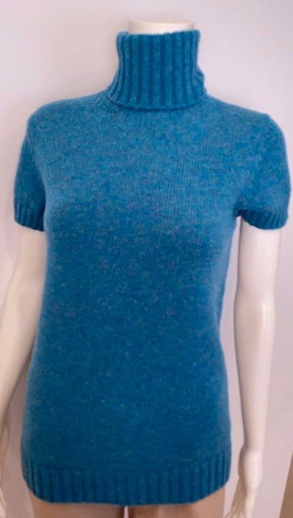 Chanel 07A, 2007 Fall Runway Ready to Wear short sleeved sweater in light muted turquoise. This unique sweater has a zip up collar in the back for 2 different looks. It can be worn as a turtleneck or cowl neck.