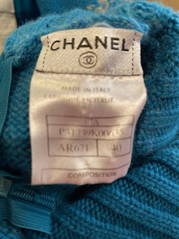 Sweater is shown with Chanel pants, Chanel light gold jeans, and beige short boots with metallic back, see “shop all”.