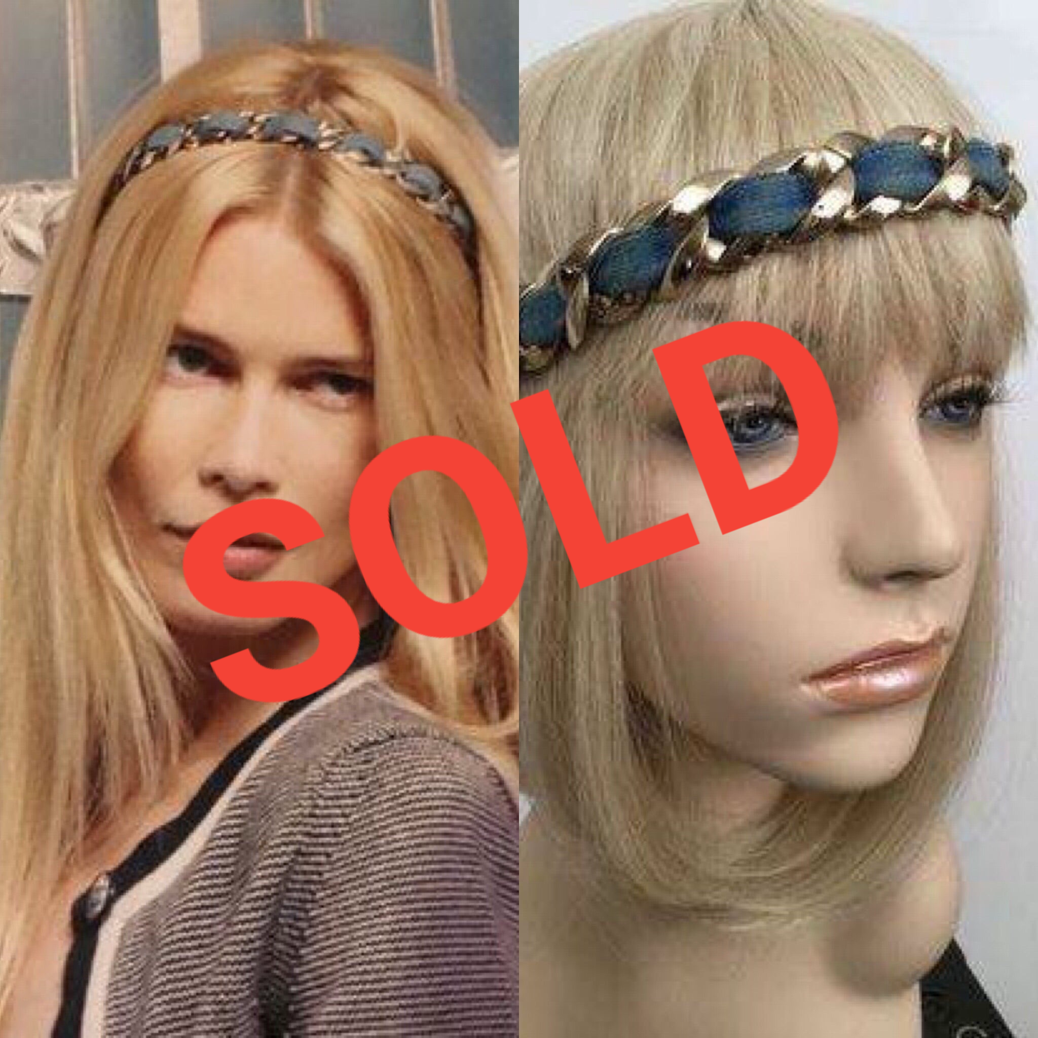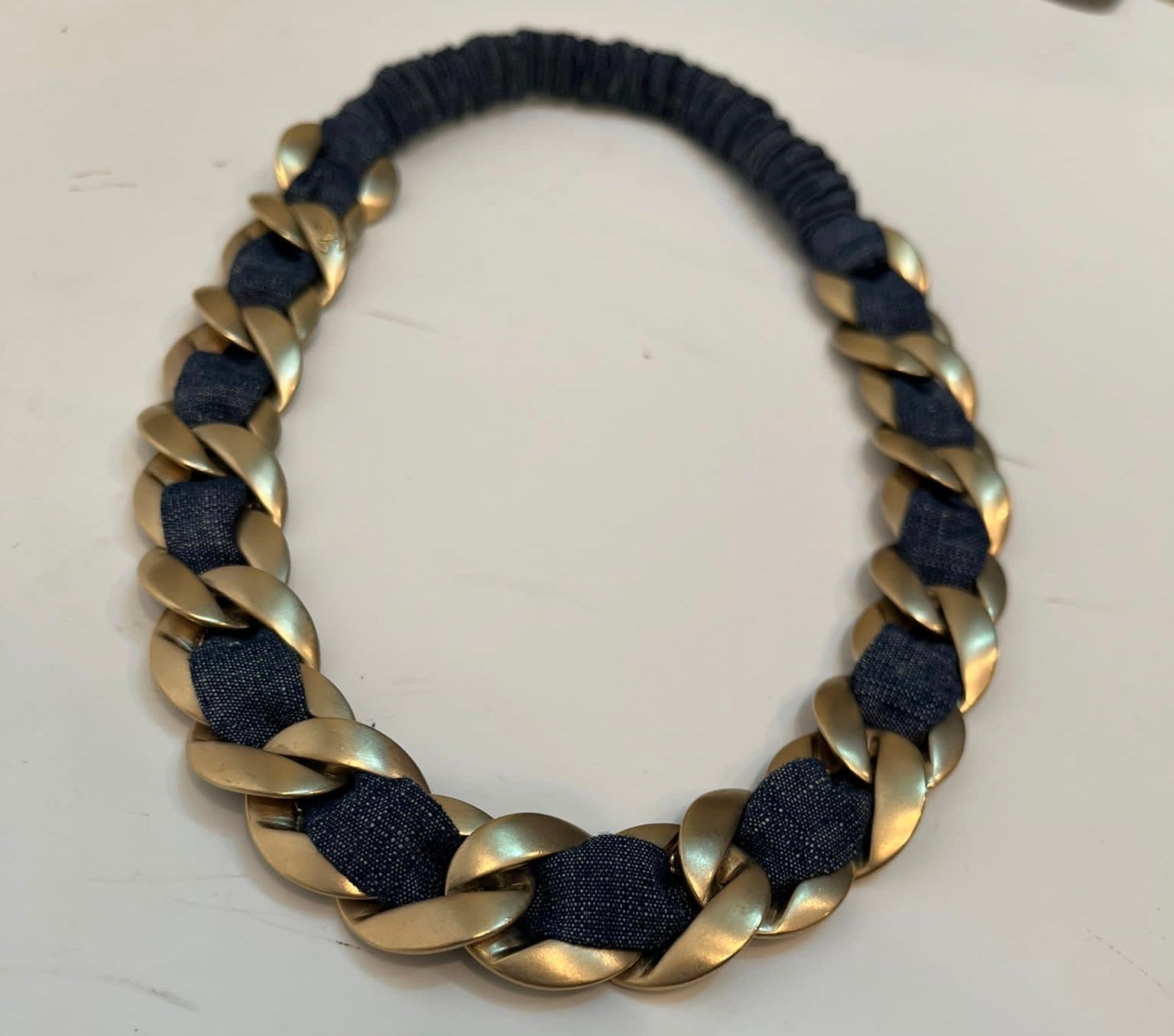Chanel denim headband woven into gold chain links and denim over elastic for stretch. From Chanel's famous 08C 2008 Cruise Resort Collection. Wear it over your forehead or on top of your head to keep your hair back. Can be worn as a hair accessory, necklace, or bracelet.