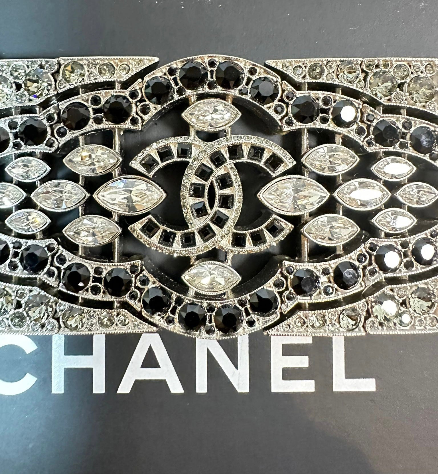 Another Chanel show-stopper! Round, oval, and square crystals set off by faceted black stones. There are 2 “CC" logos filled with small, faceted, square stones. The bracelet measures anywhere from 6 1/2" to 8" long depending upon which