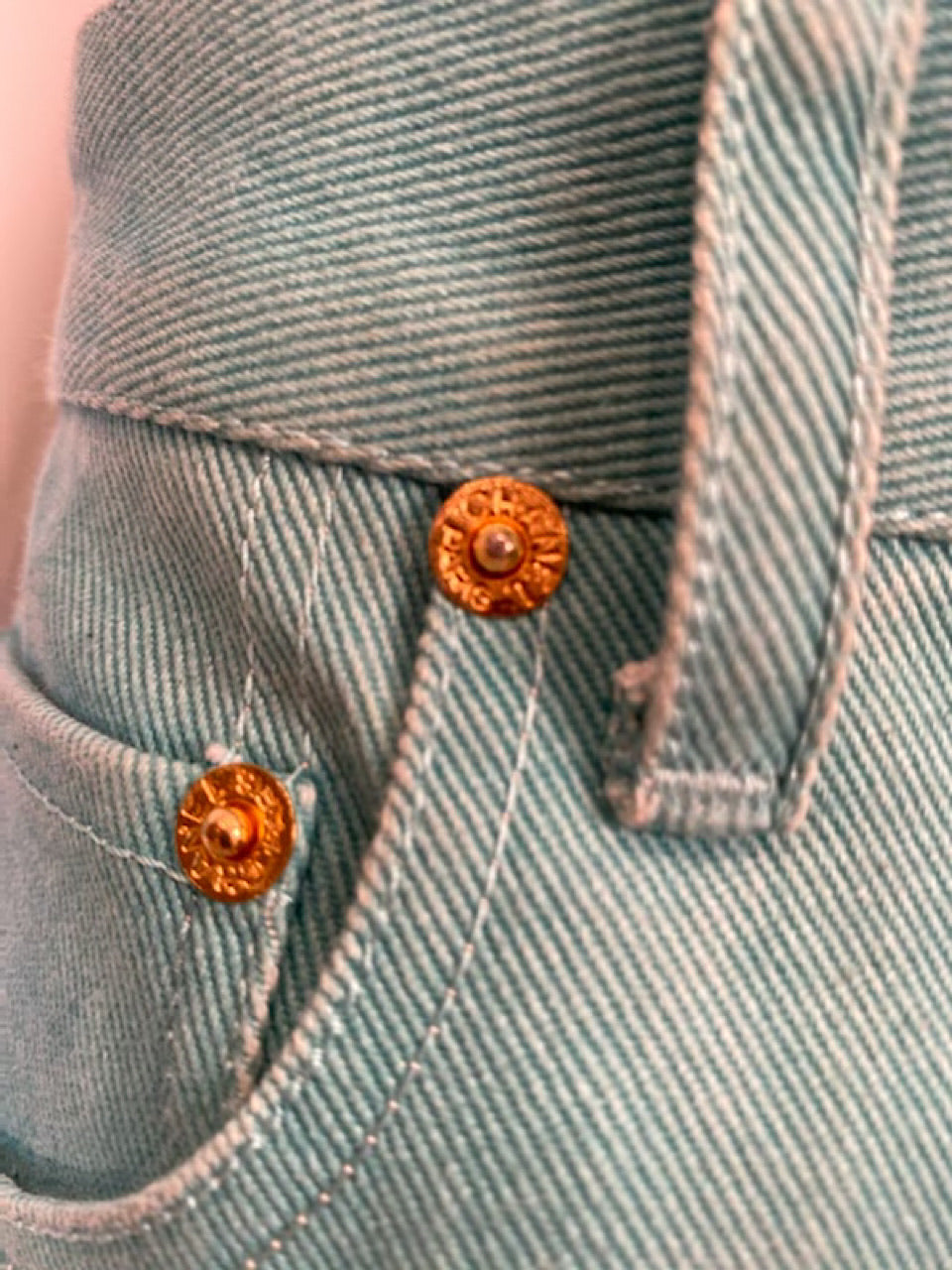 The jeans are short, with topstitching typical of jeans. There are rivets at the corners if the curved  pockets in the front they have "Chanel Paris" on each one. The Chanel label is on the outside back pocket seam and each back pocket has a large 3" by 3 3/4" CC logo formed by matching stitches. There is a Chanel gold  button at the waist Top of the button fly.