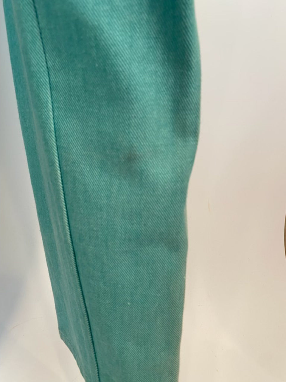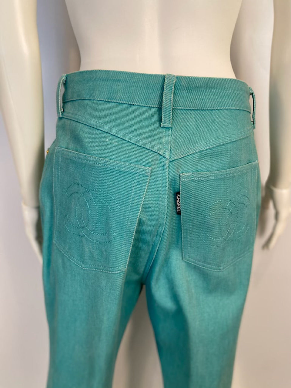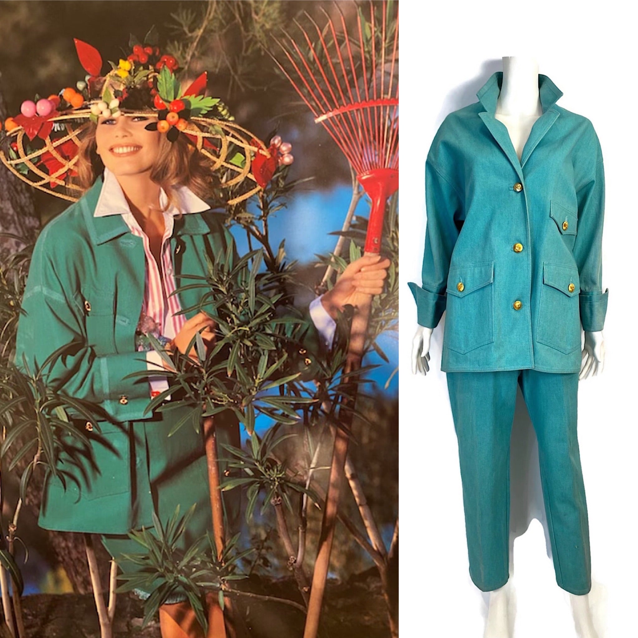 92P, 1992 Spring Chanel Green Denim 2 piece Jacket Pant Suit Oversized FR 34 US 4/6/8
