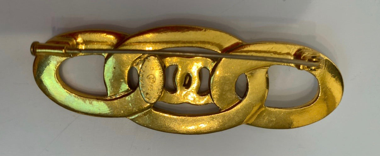 Rare Vintage Chanel CC enamel pin from the 93C, 1993 Cruise Resort Collection. White and black enamel with the Chanel "CC" logo in the center with gold plated metal. The pin is 3” long.