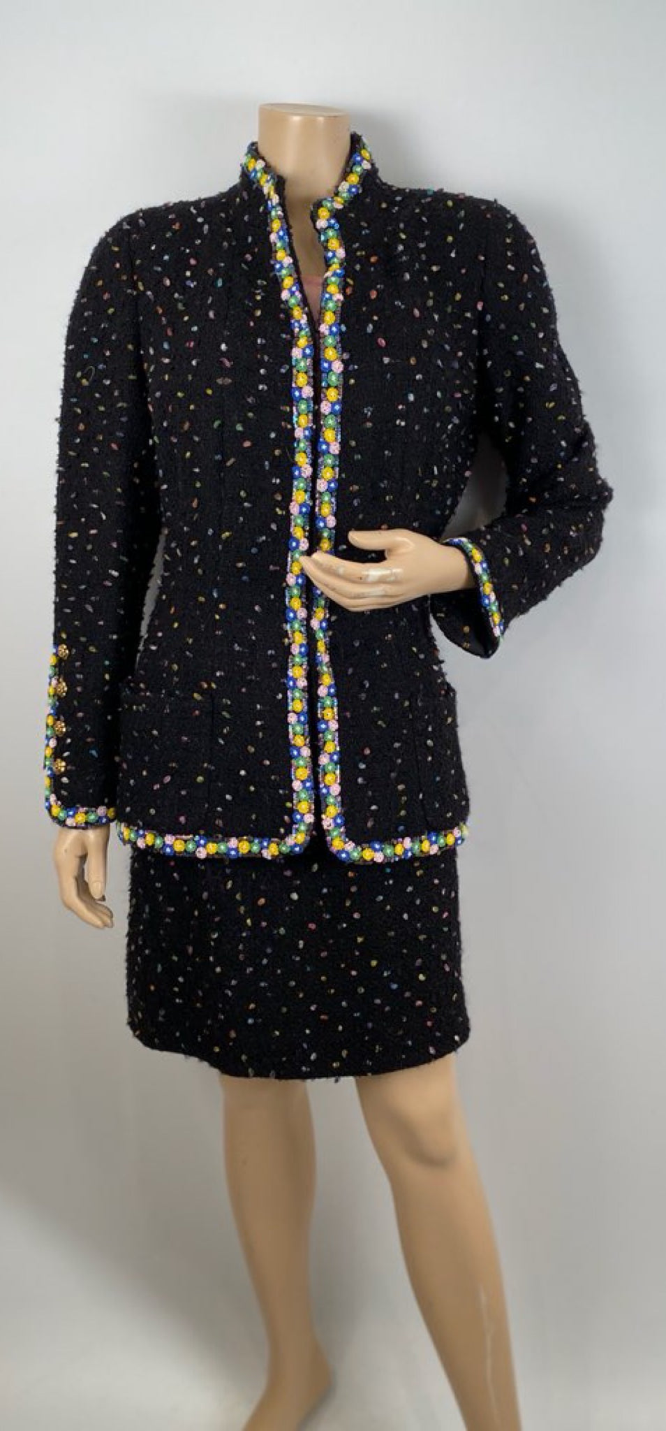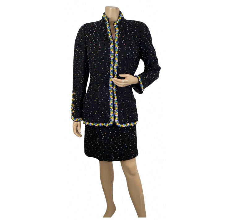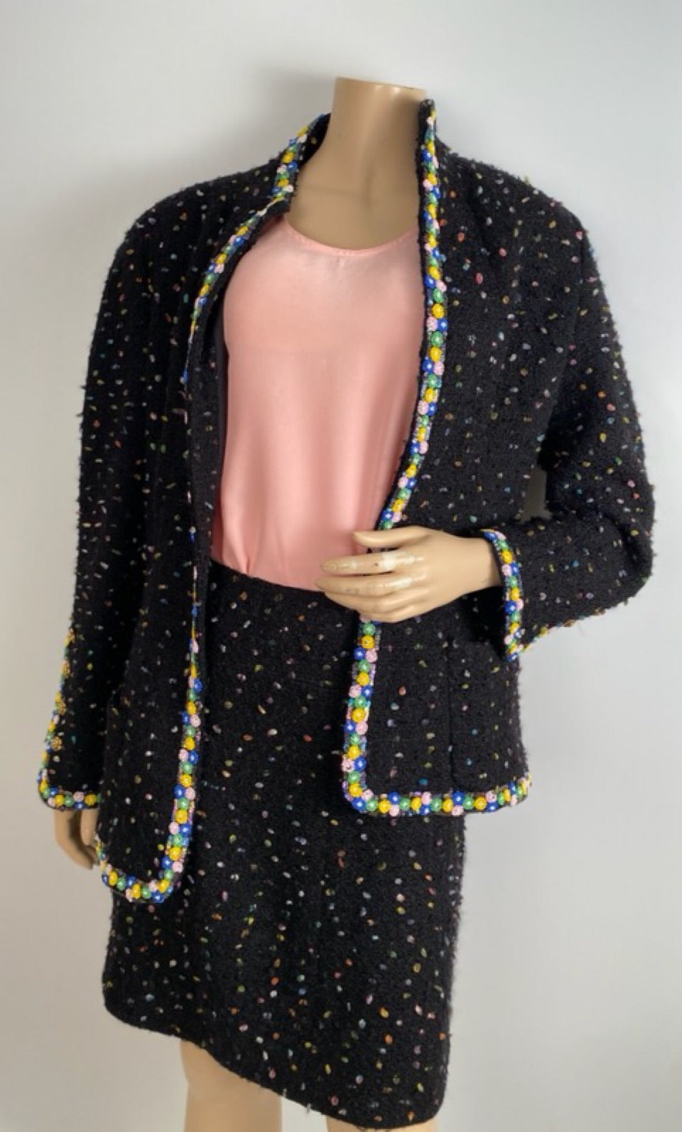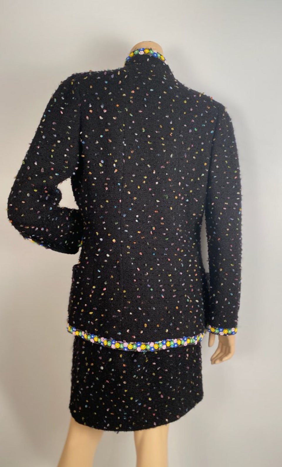 Very Rare Chanel confetti suit 2 piece skirt and jacket set trimmed with colorful beads and sequins.