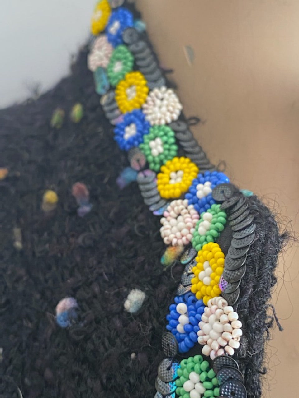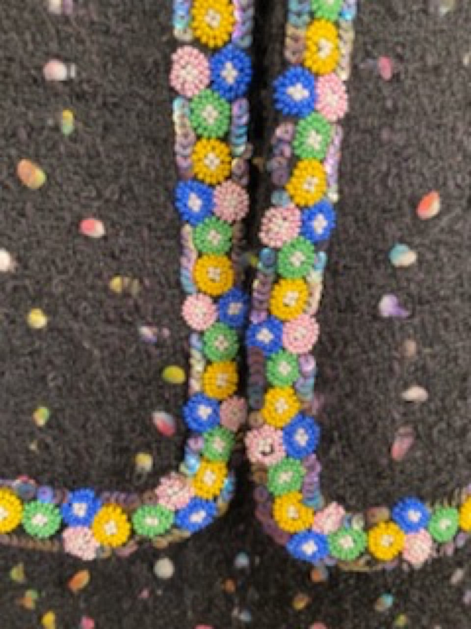 This style is called a “confetti” suit because of all the colorful specs throughout. It is a very textured fabric with raised tufts of colorful yarn, coordinating with the colors of the beaded trim that is 9.5 feet of colorful beads shaped like flowers trimmed with sequins around the edges of the suit.