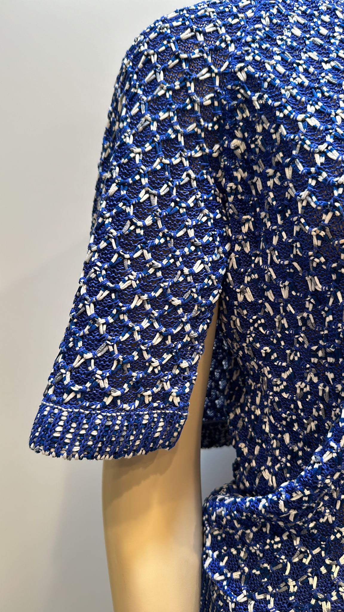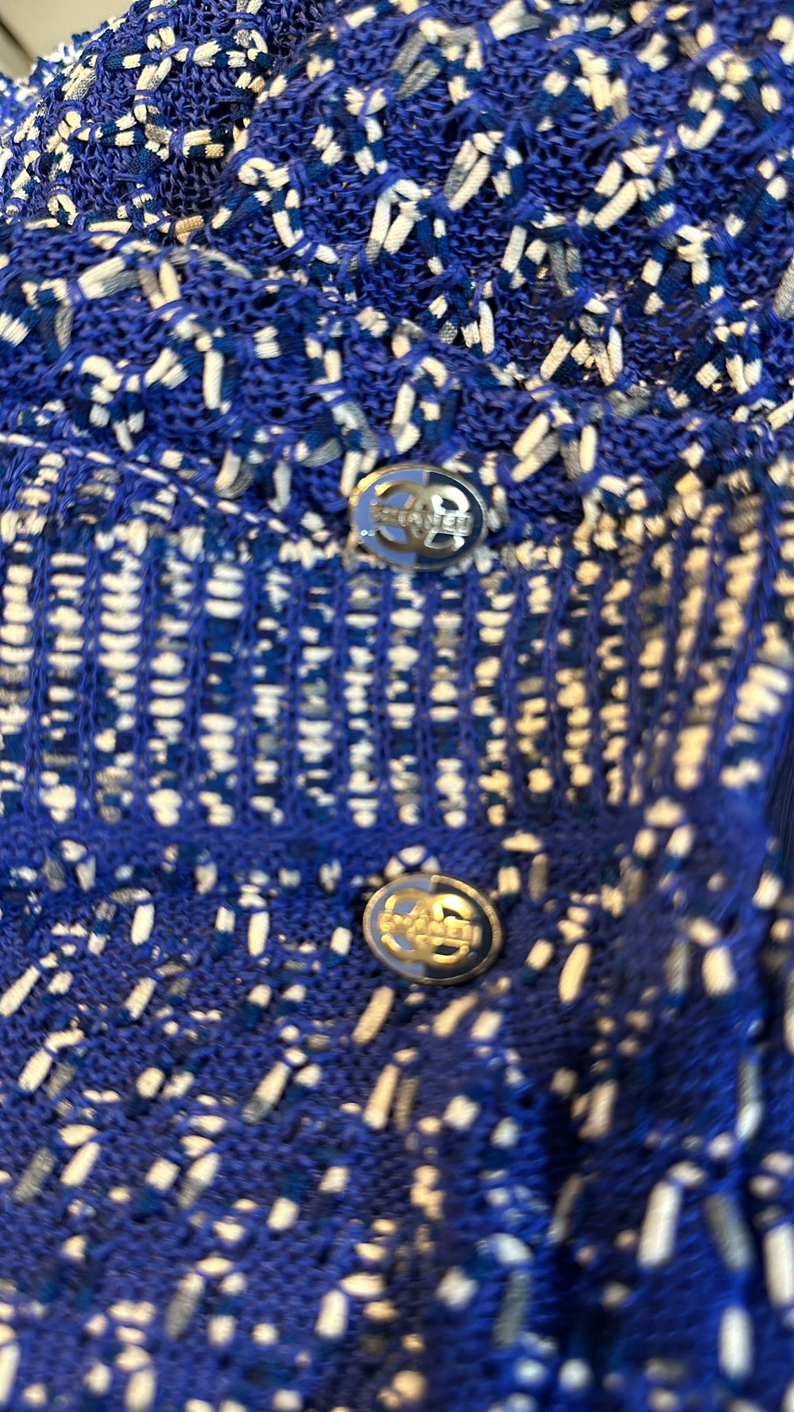 Royal Blue with white loose weave, unlined, slightly stretchy. Both pieces have a metal Chanel oval colored decorative button near the waist which has a large metal CC logo.