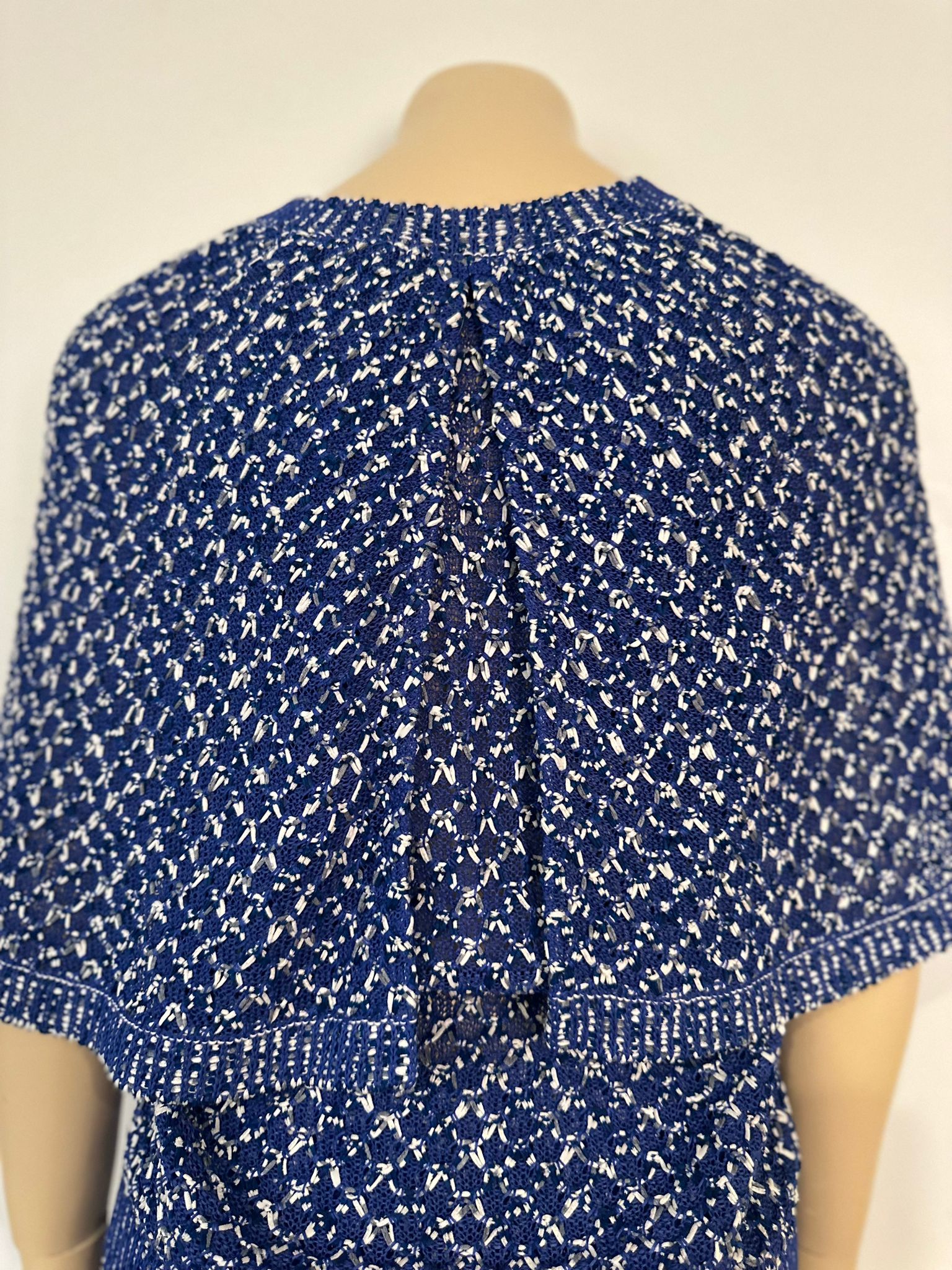 Meant to be roomy, with a shallow V neck. The and sleeves form a unusual cape back which is attached to a sleeveless top. The ribbed bottom can be worn at the waist or pulled down to go towards the hips.
