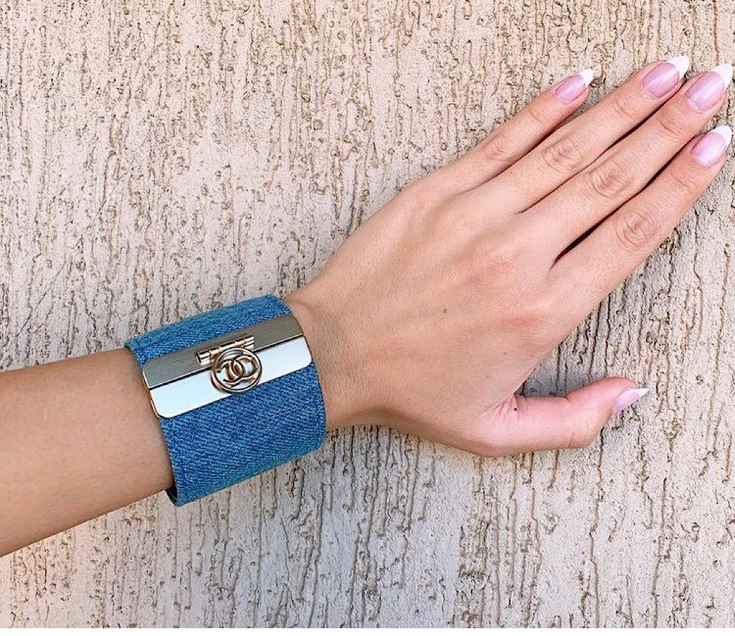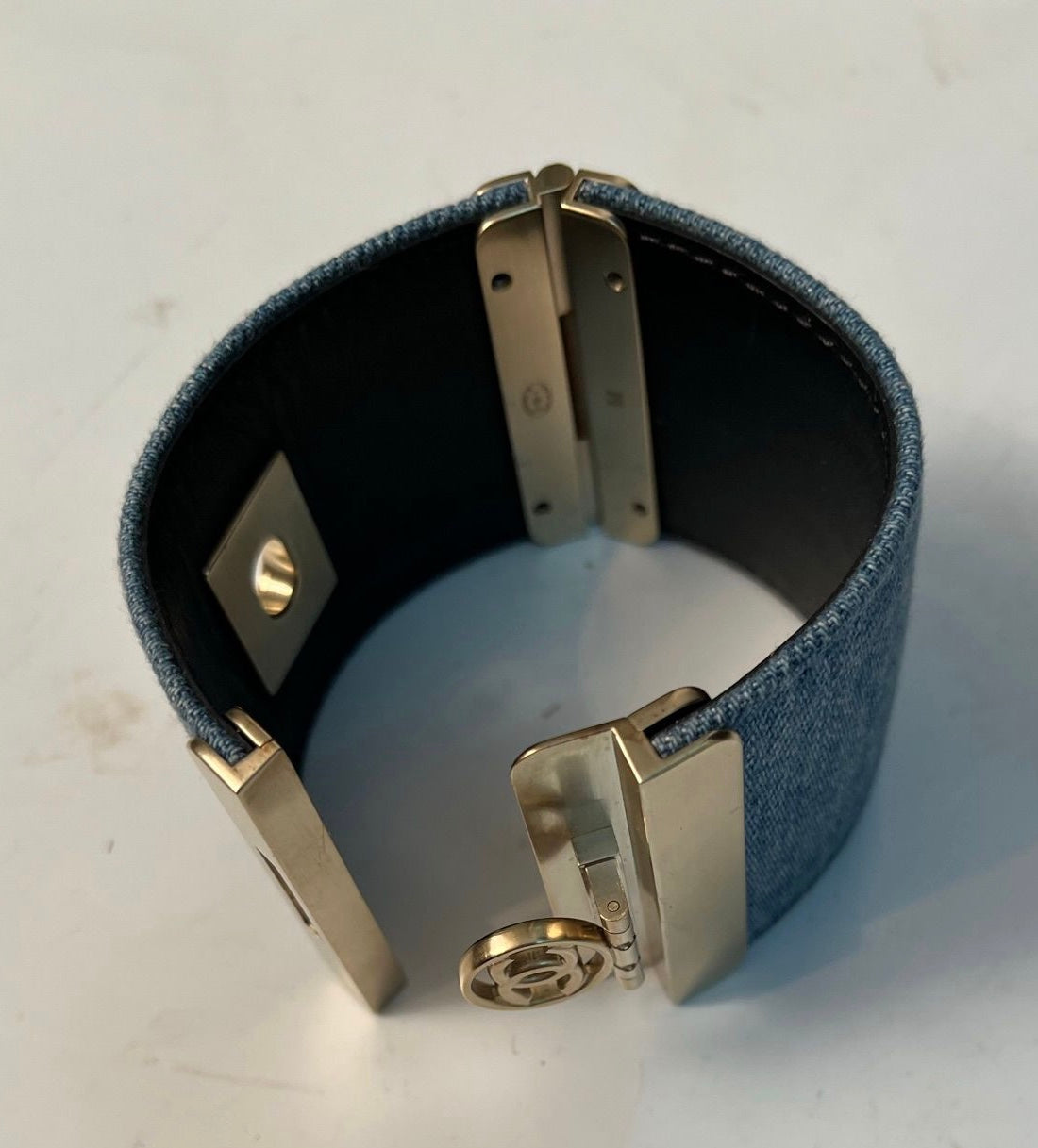 Chanel 17P, 2017 Spring Collection denim Cuff bracelet. This Chanel bracelet is in perfect condition, and comes with the original Chanel box which has 4 velvet flaps to keep it looking new, the velvet case shows some wear but keeps the bracelet protected and beautiful.
