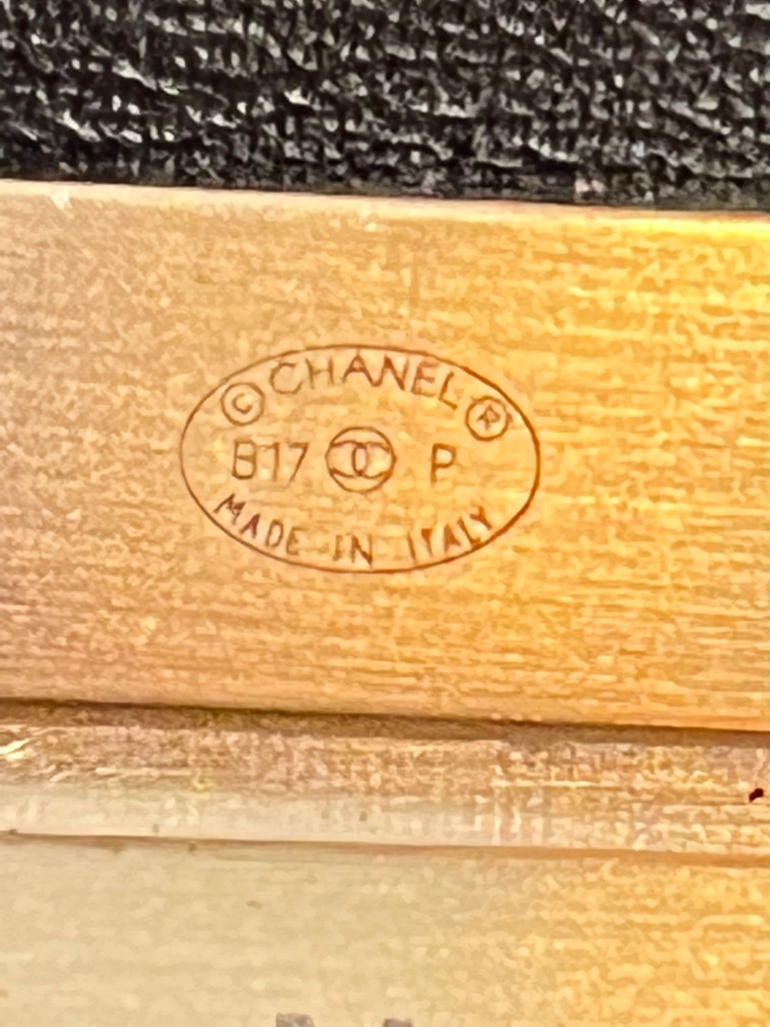 It has magnetic closure and a turnkey closure as well. It has metal hardware and the lock is a 1/2" wide gold CC logo, the words "Chanel,Paris” are in the metal on the opposite side of the closure. The identification oval is etched into the metal on the inside of the cuff. This is a versatile and unusual piece of jewelry.