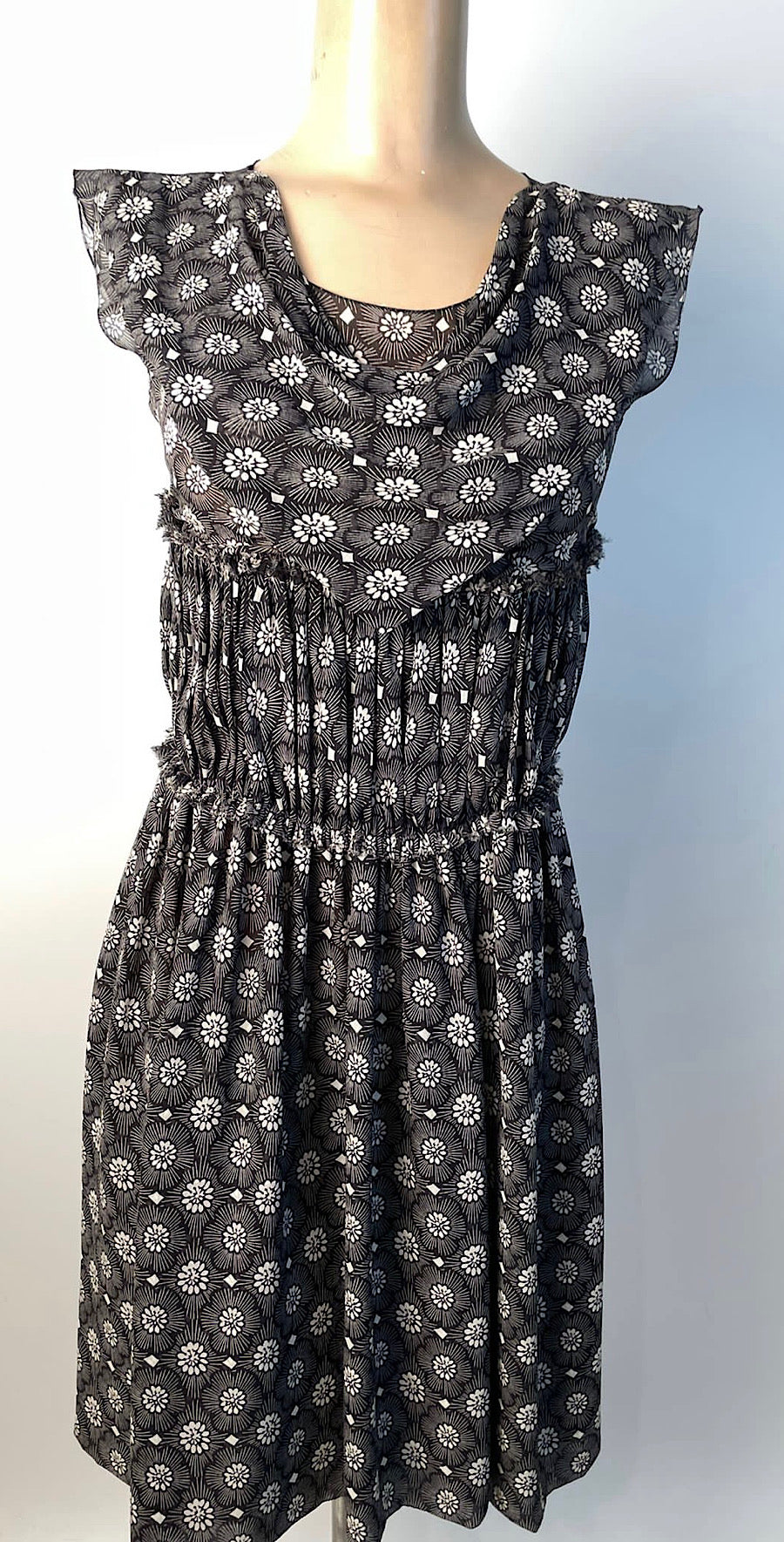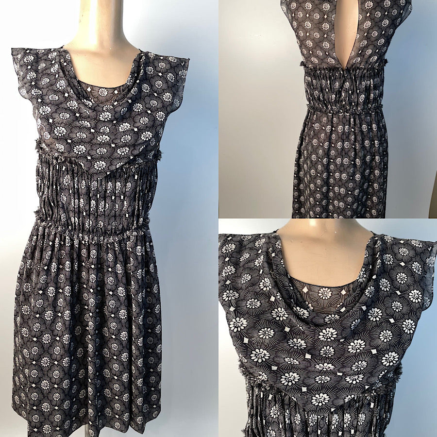 Sophisticated ,filmy, with a slit keyhole back. There is a 7" area that cinches the waist which is gathered, with tiny pleats in the center. This area also has stays/boning sewn into the seams. The skirt is gathered and full. The top is sleeveless, with a draped front, and a keyhole back, buttoned in the back at the neck with a metal Chanel button with the "CC" logo. Lined with Chanel logo silk.