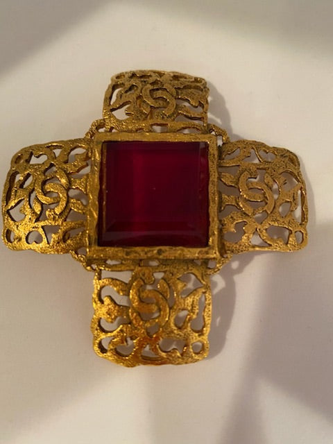 Rare Vintage Chanel mid 1980’s brooch pin. Elaborate gold cross open work on 4 sides with. “CC” logo on each, in the center is a perfect red beveled square stone. 7/8” on each side. The pin itself measures 3” across in both directions.