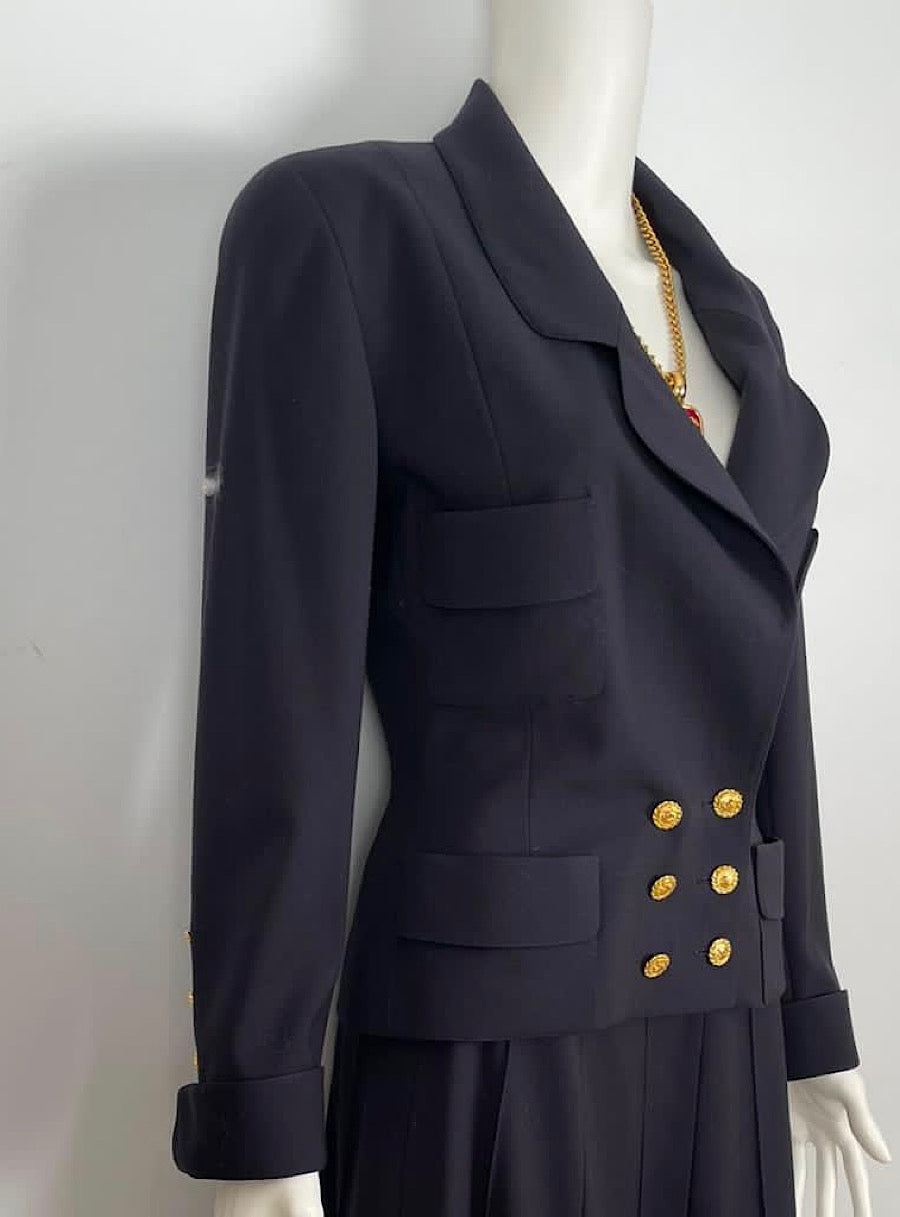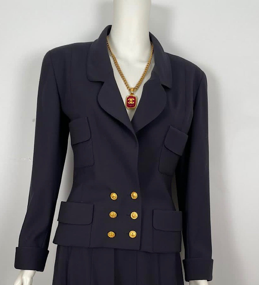Chanel Boutique vintage late 1980's double breasted jacket in navy blue with gold buttons. It has 14 Chanel logo buttons 6 on the front and 4 on each sleeve. Fabric is a smooth wool, lined with subtle logo silk. The jacket has rounded lapels, 4 small patch pockets, double breasted.