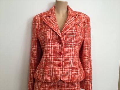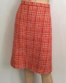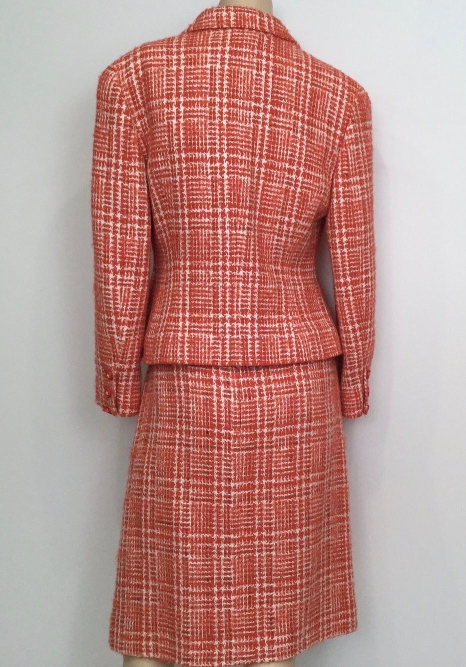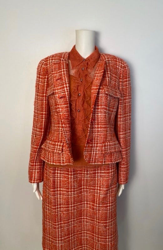 97P, 1997 Spring Vintage Chanel Boutique Orange Plaid Wool Tweed Jacket Blazer Skirt Suit Set US 8/10