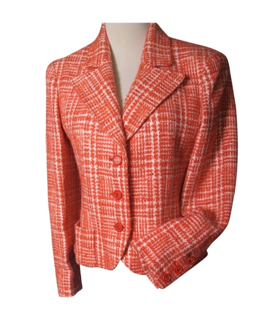 The colors are orange, pink, and white tweed. This jacket has a collar and lapels, slightly tapered waist with 9 Chanel buttons with raised gold "CC" logos. Fully lined, and has the famous Chanel gold chain around the bottom to make sure it hangs evenly. There are 2 shallow pockets in front at the hips.