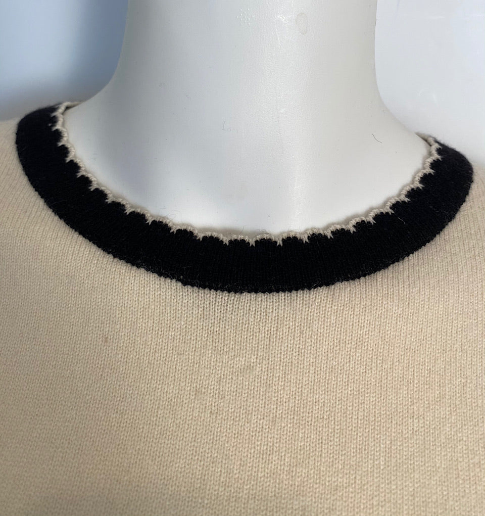 Winter white chanel short sleeved knit sweater with black scalloped neckline. This sweater is missing the information/ size tag but it feels like a cashmere blend, estimated US Size 6.